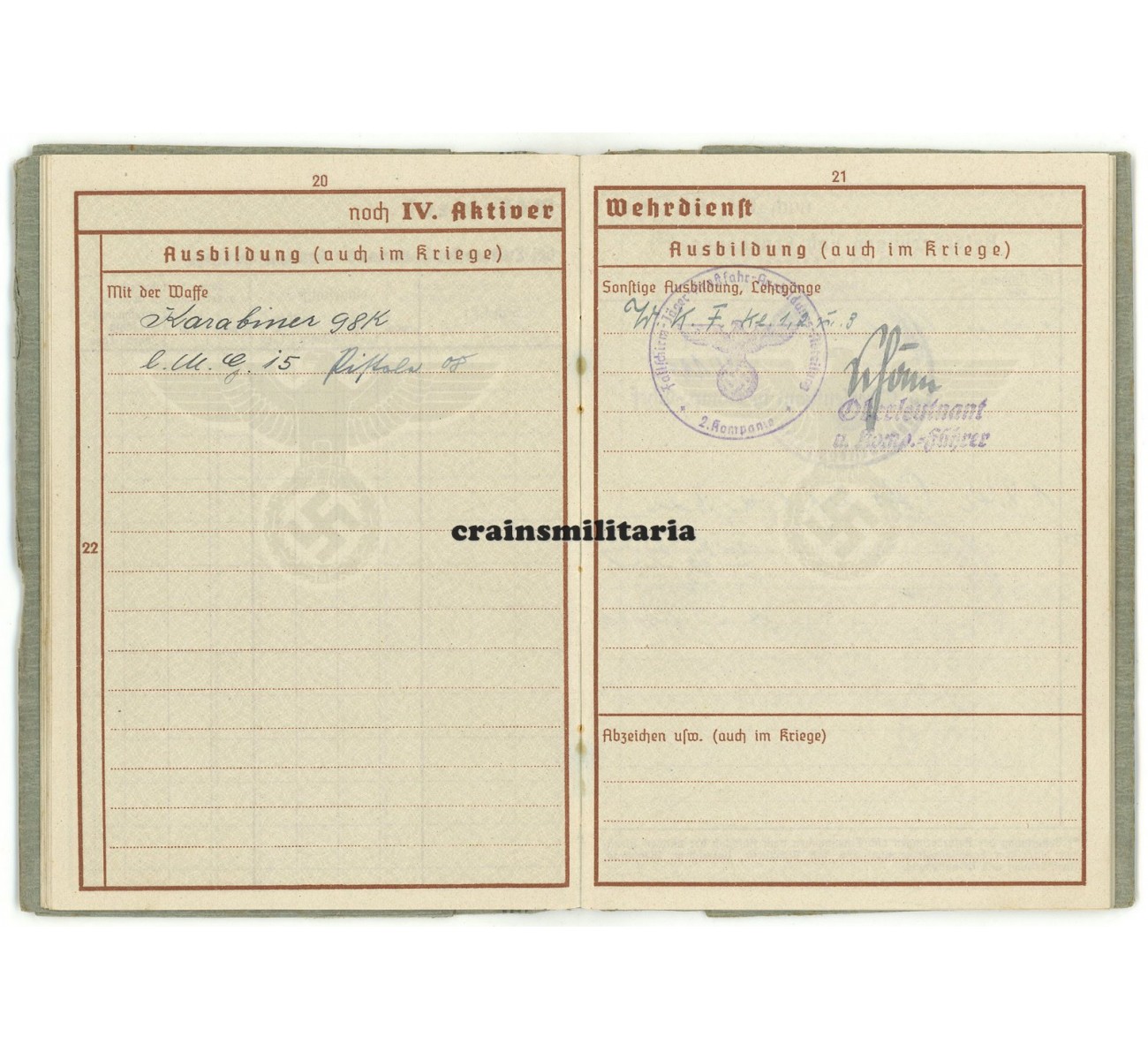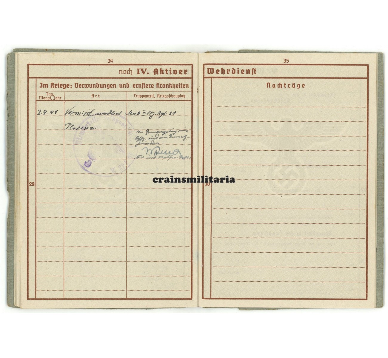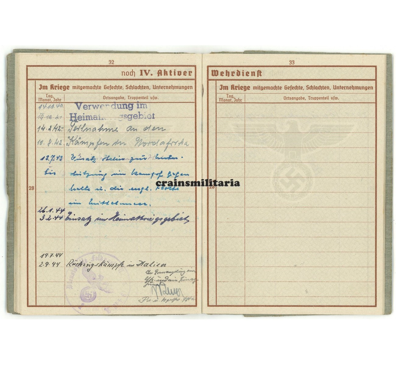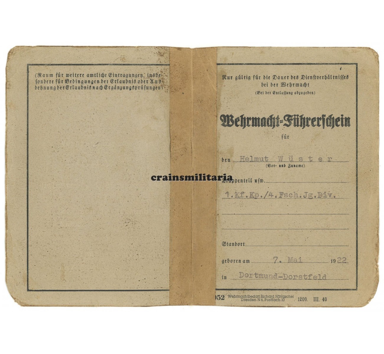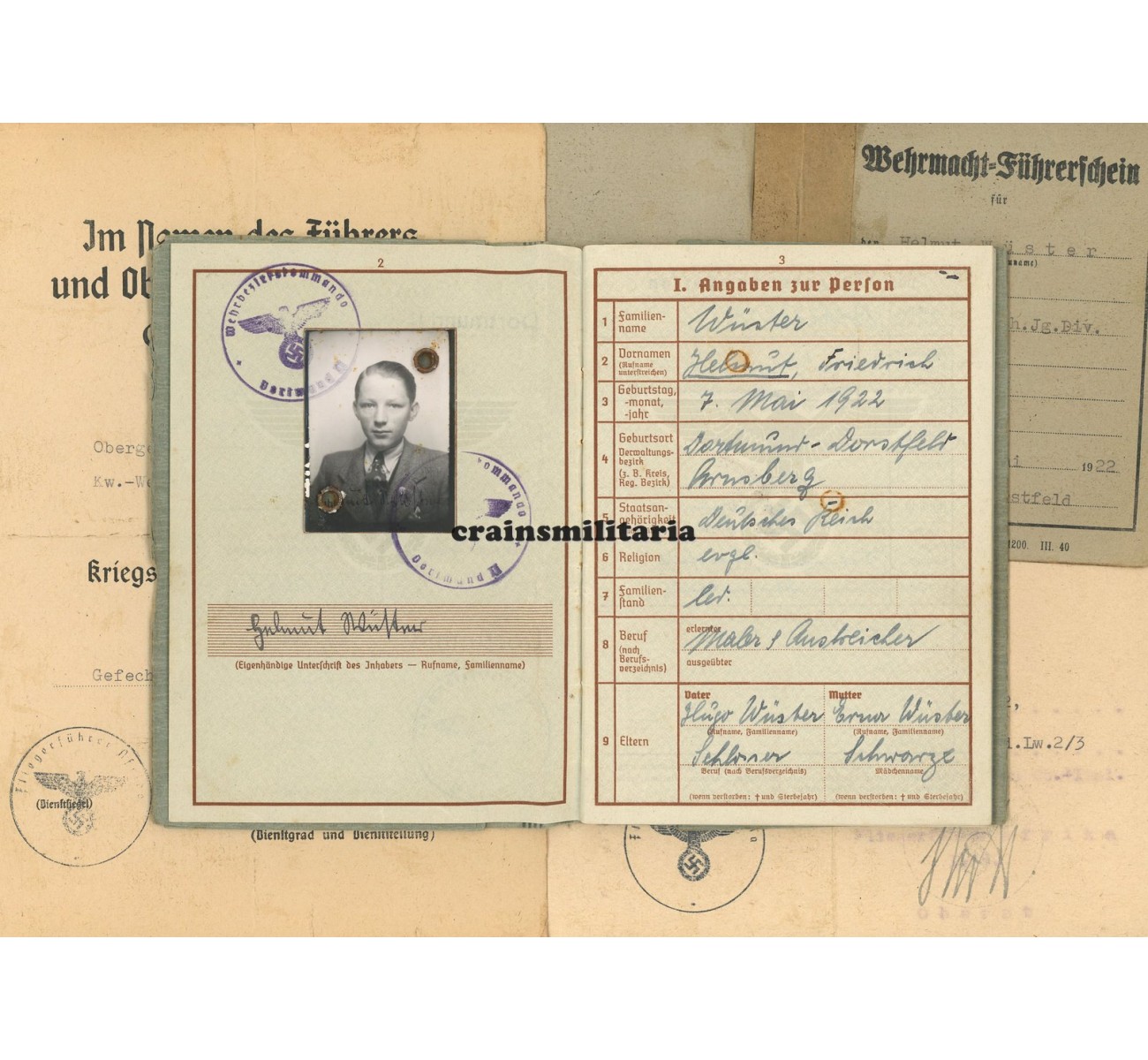 - Wehrpass, first issue from July 1940, in very good and complete condition, with Fallschirmjäger entries, Africa awards including a curious entry "Lybien-Erinnerungsmedaille", MIA entry "nördlich Florenz" with III./FJR.10, and a nice portrait photo as a young boy.