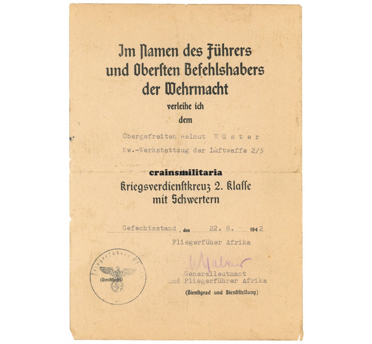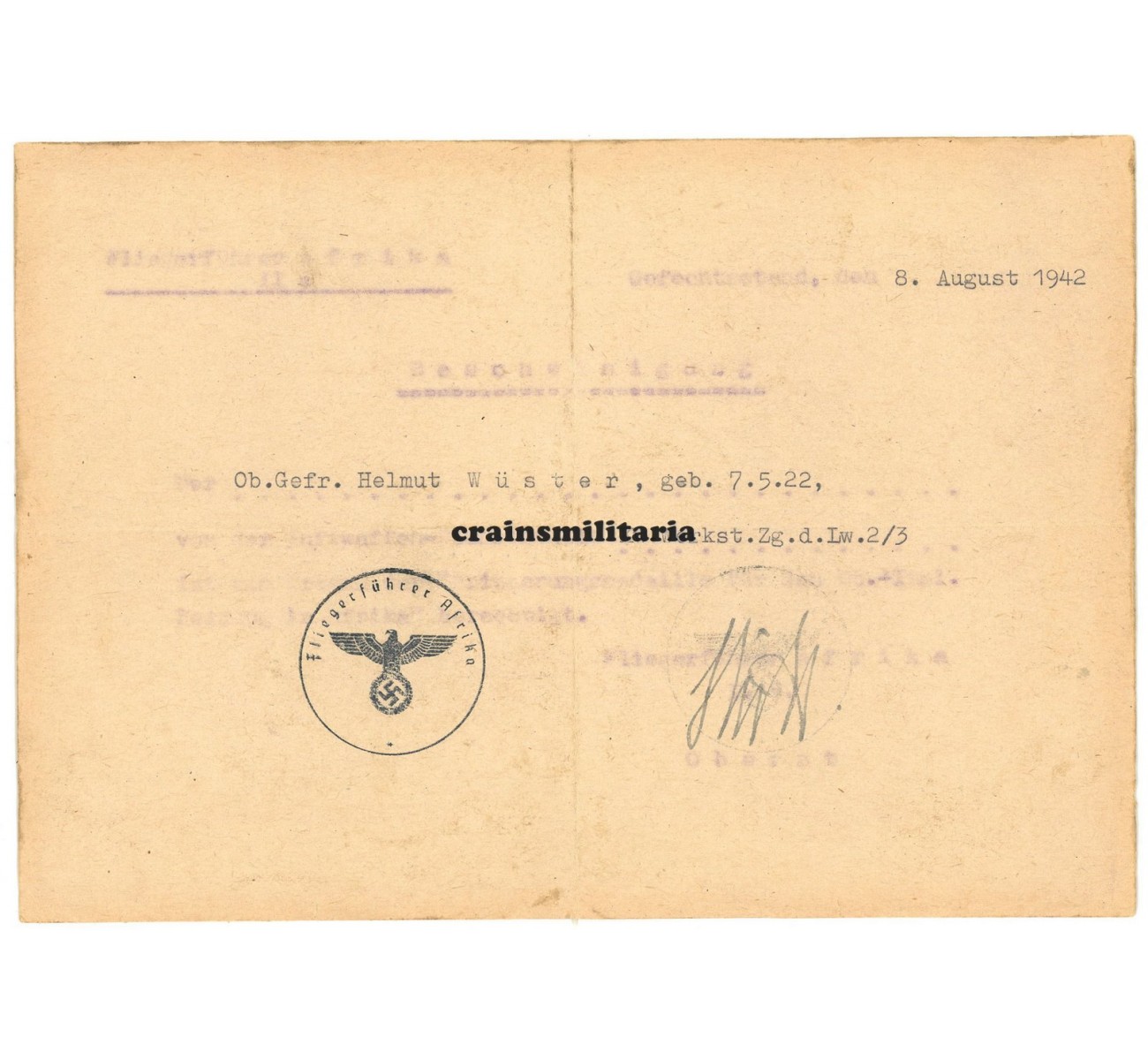- Award document for the German-Italian commemorative medal, August 1942, by an Oberst of Fliegerführer Afrika.