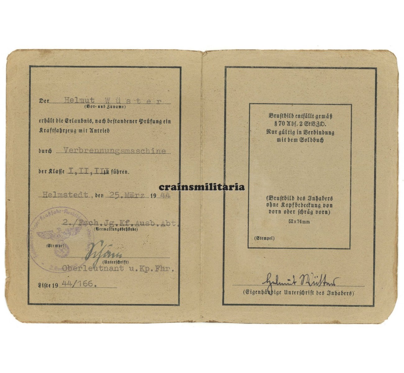 Wehrpass and award document grouping to Obergefreiter Helmut Wüster. This young Dortmund based man joined the Luftwaffe in July 1940. He received basic training and then a six week training as Fallschirmjäger with the 7. Flieger-Division, before joining the Fliegerhorstkompanie of Altenburg for a year in 1940-'41. In 1942, he served with the Kraftwagen-Werkstattzug der Luftwaffe 2/3, which brought him to the African theater. Wüster earned the German-Italian commemorative medal, the KVKII and the "Afrika" cufftitle for his deployment with the DAK, staying in Italy after his dismissal from Africa.
