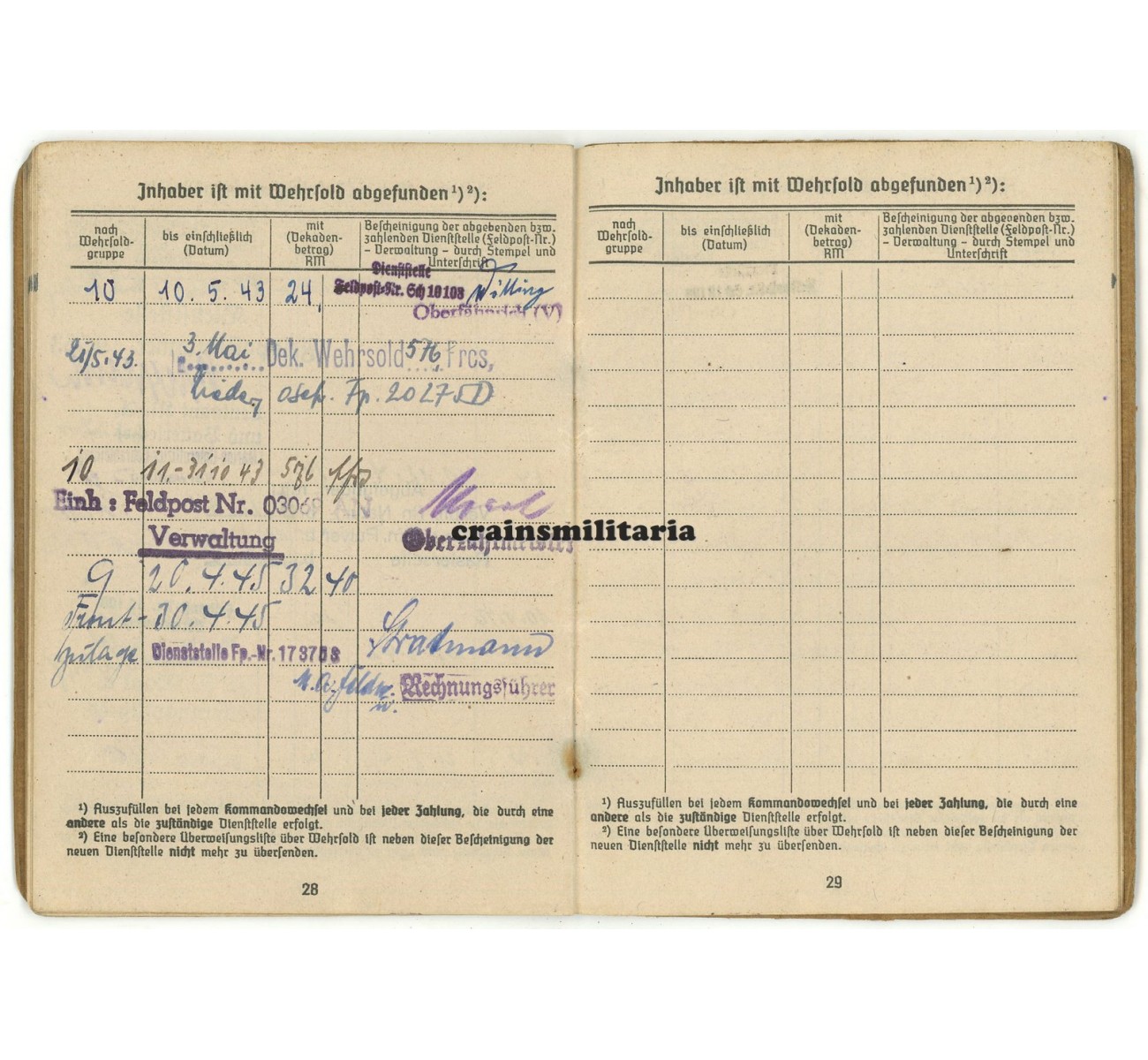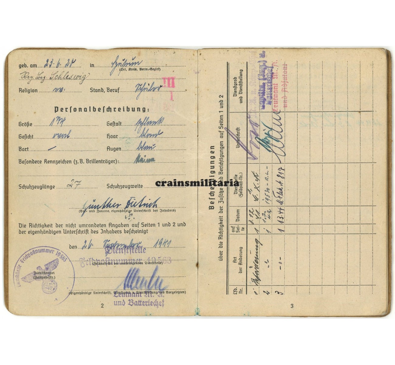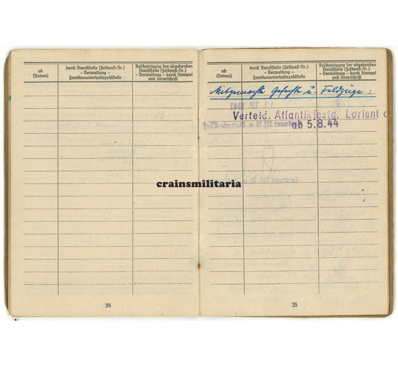 - Soldbuch, first issue from September 1941, complete including the portrait photo. Interesting entries include his "Festungs-Stamm-Nummer" on page 1 and a Frontzulage in April 1945 both related to Festung Lorient, the rare battle entry for "Verteidigung Atlantikfestung Lorient ab 5.8.44" on page 35, the two award entries also connected to the Festung, a pistol and a private watch, and more.