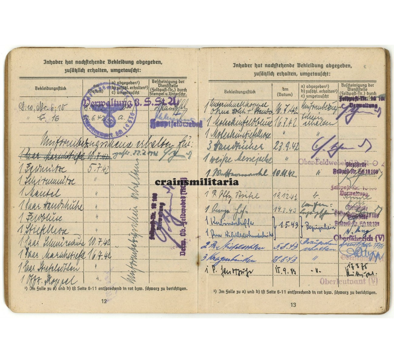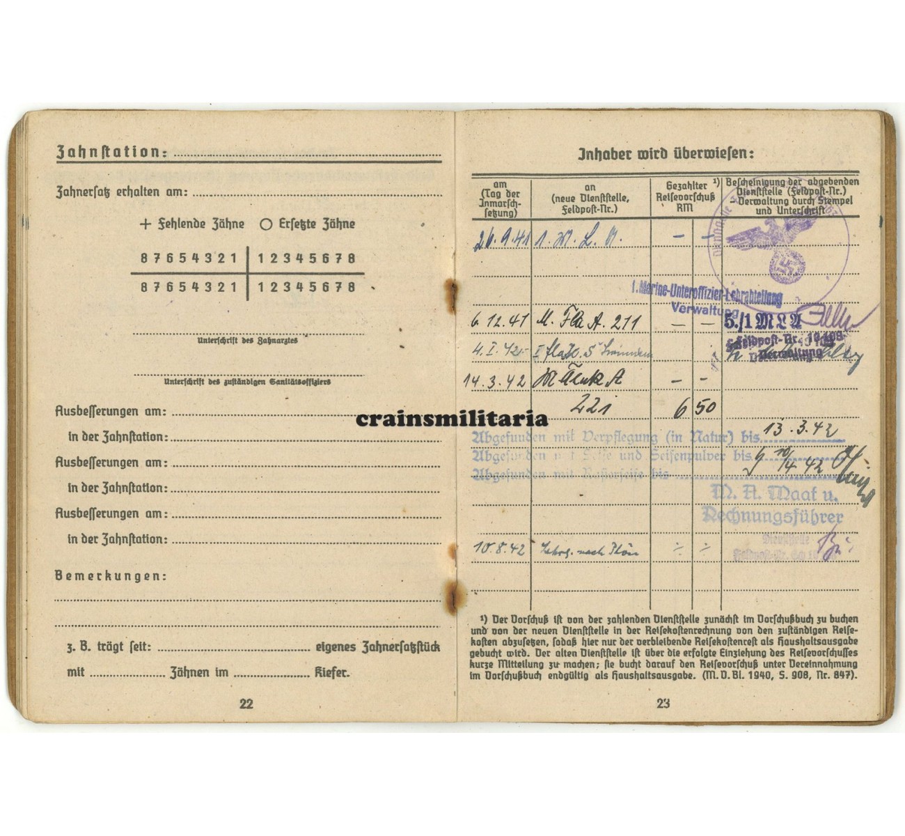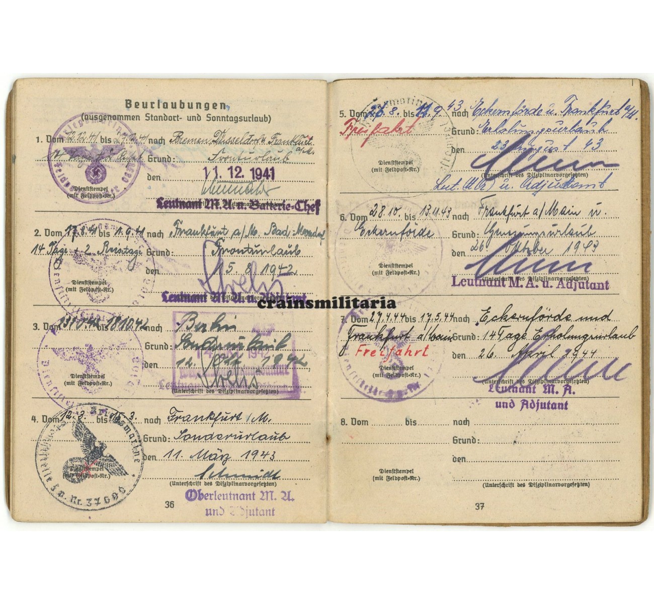- Soldbuch, first issue from September 1941, complete including the portrait photo. Interesting entries include his "Festungs-Stamm-Nummer" on page 1 and a Frontzulage in April 1945 both related to Festung Lorient, the rare battle entry for "Verteidigung Atlantikfestung Lorient ab 5.8.44" on page 35, the two award entries also connected to the Festung, a pistol and a private watch, and more.