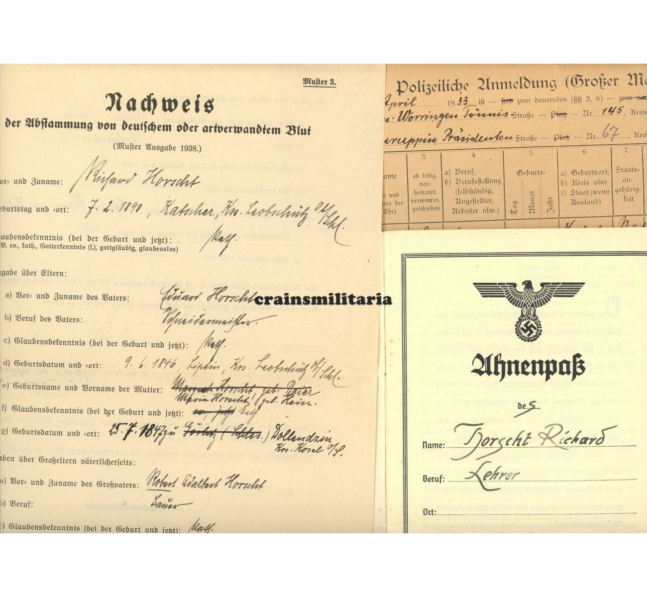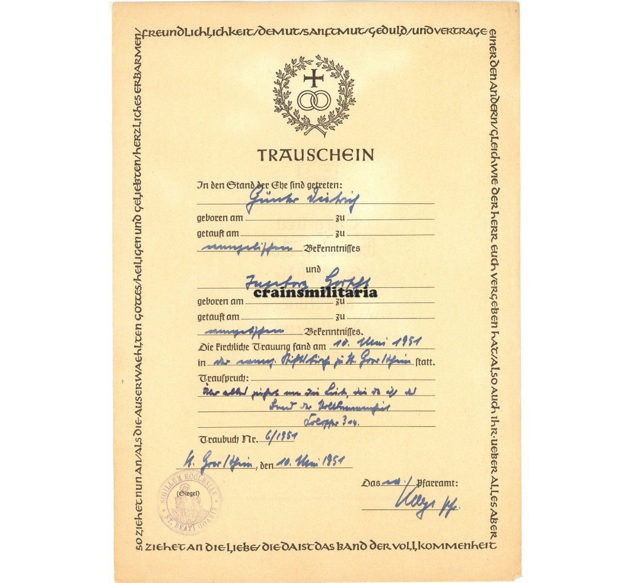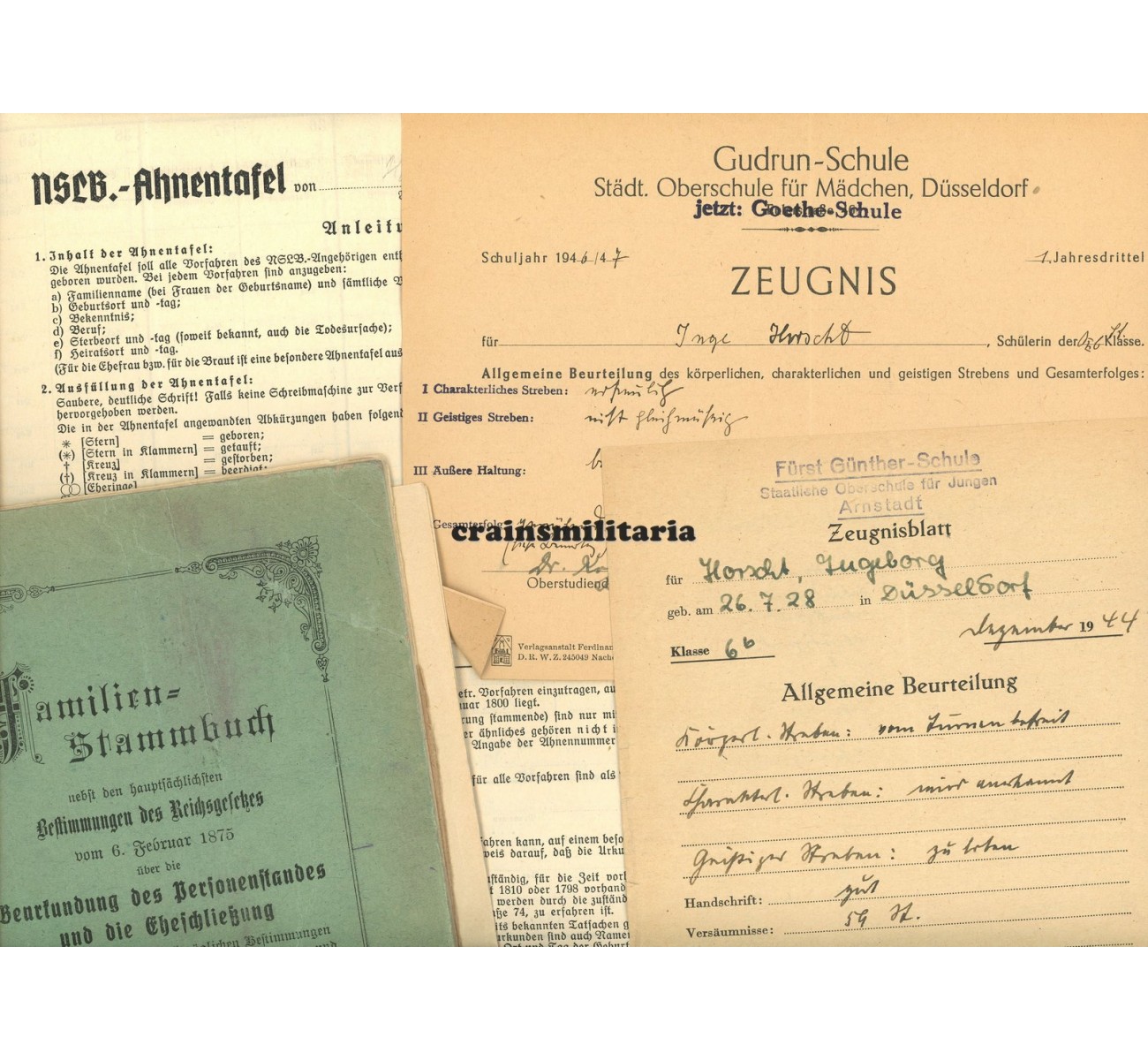 - Wedding certificate from 1951, plus extensive wartime and prewar document grouping to his (future) wife Ingeborg Horscht, daugther of a teacher in Düsseldorf. Included are the Third Reich Ahnenpass to her father, Ahnentafel of the Nationalsozialistische Lehrerbund, prewar Familienstammbuch, declaration of Aryan descent, many school papers and more... only a small part is shown here.