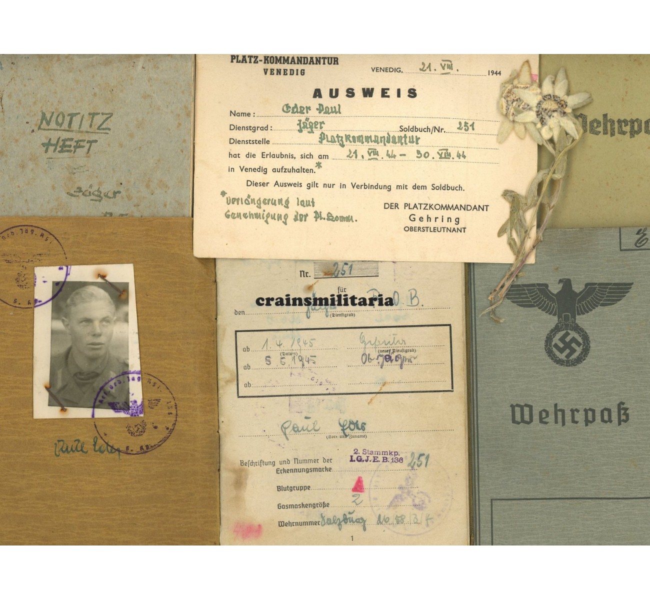 - Rare Ausweis by the Platzkommandatur Venedig, allowing him to visit the city in August 1944.