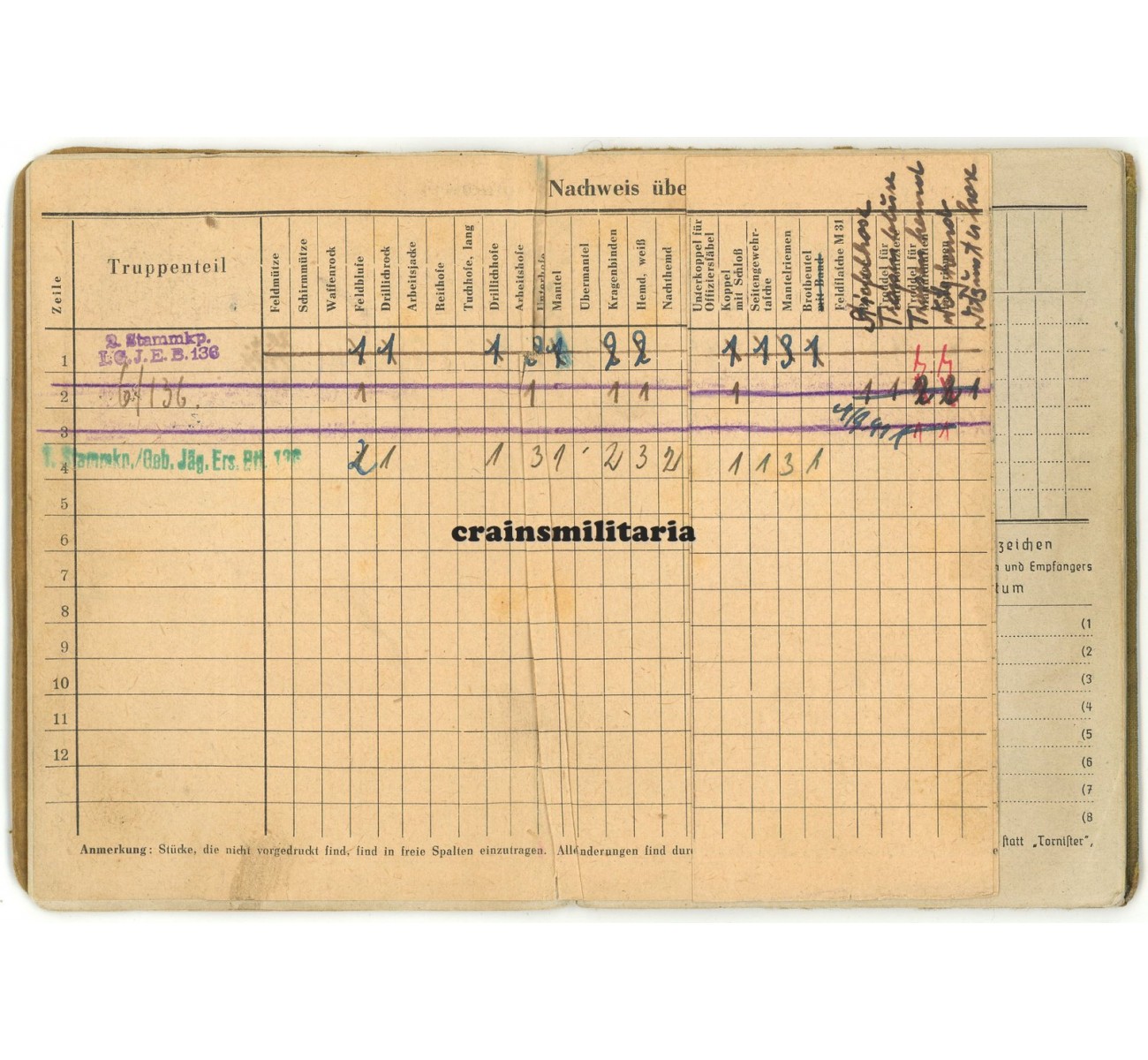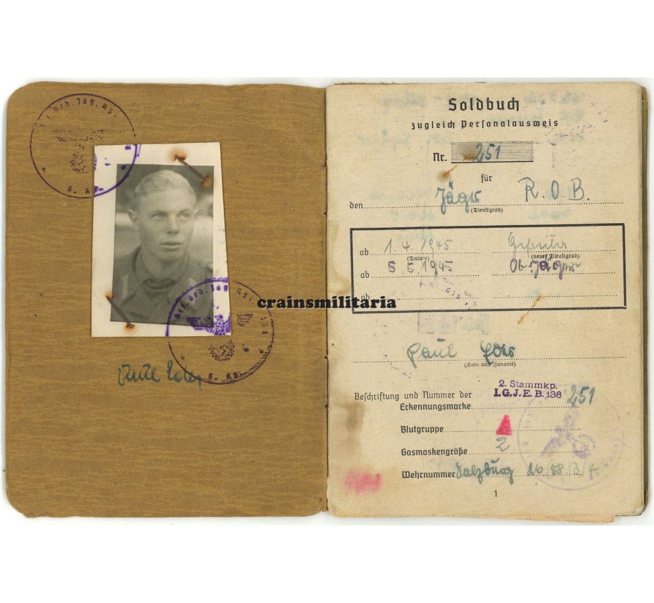 The Soldbuch is in complete and very good condition, including a great portrait photo in late M44 Feldbluse, the rare anti-partisan list and equipment entries such as tropical uniform. It comes with the following extras: