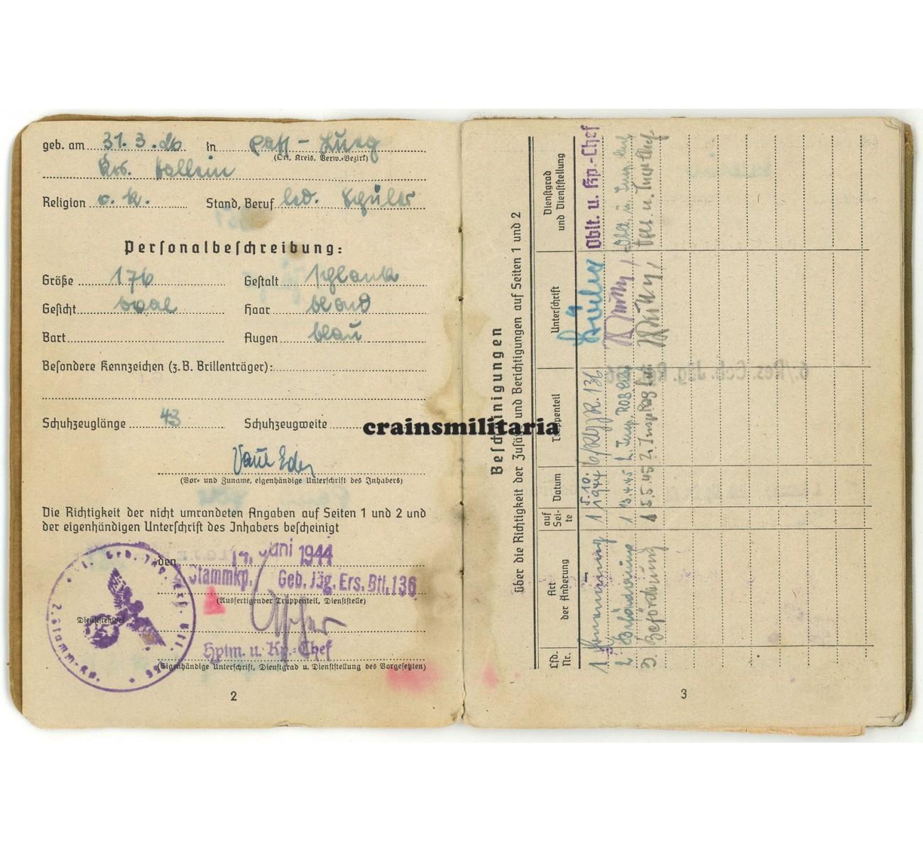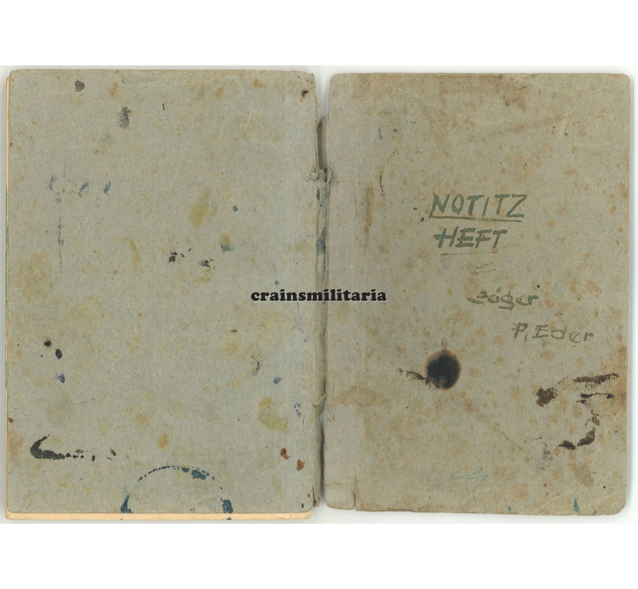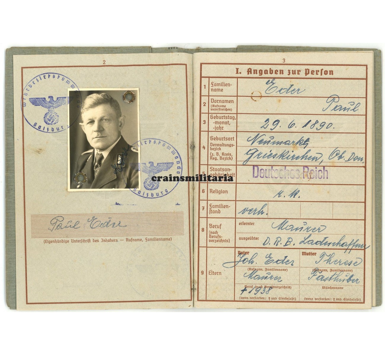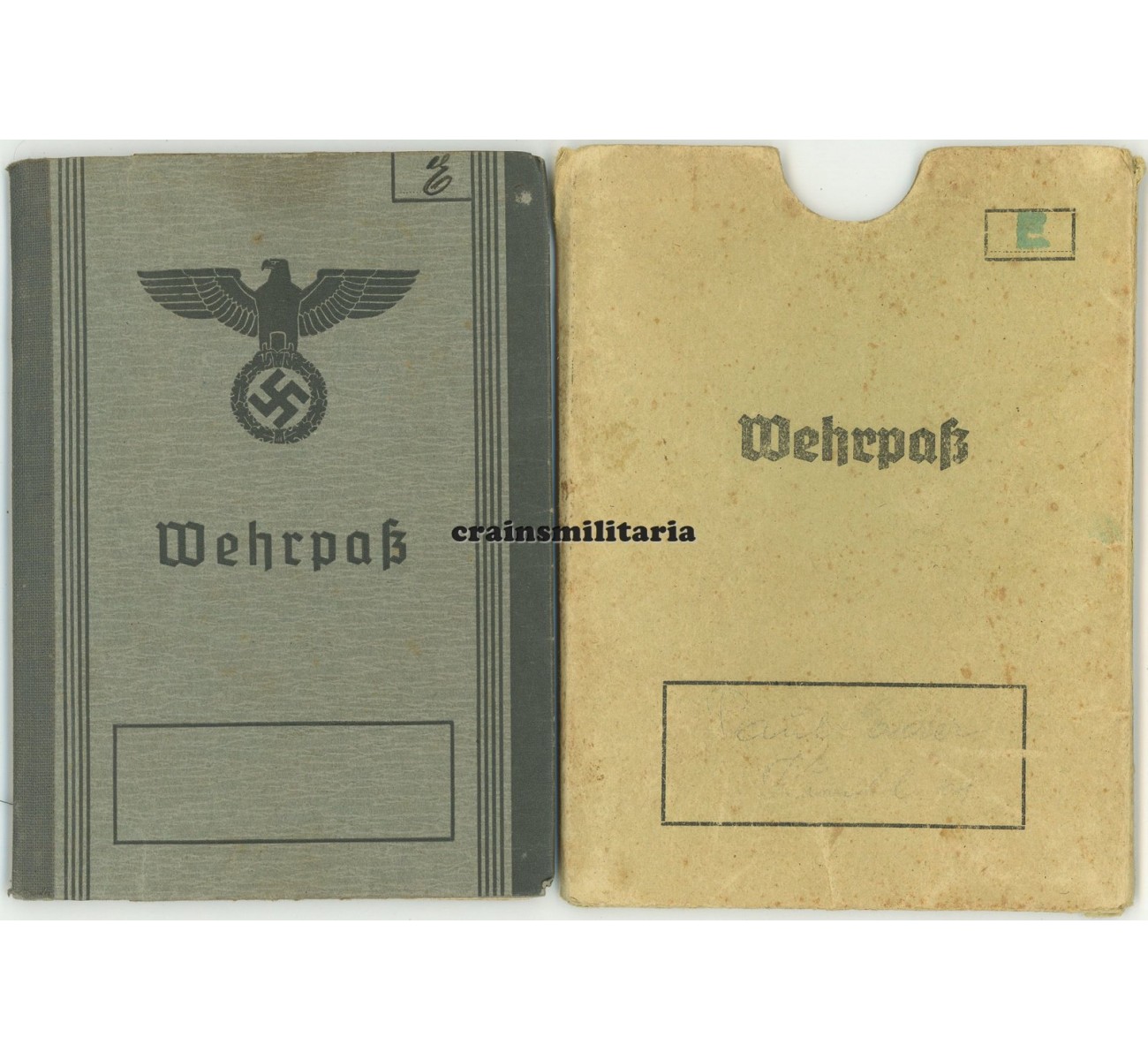 - Wehrpass to his father Paul Eder, with nice portrait photo in Reichsbahn uniform, minimal entries but perfect condition, plus a cardboard cover and two "Wehrpass-Notiz" documents.