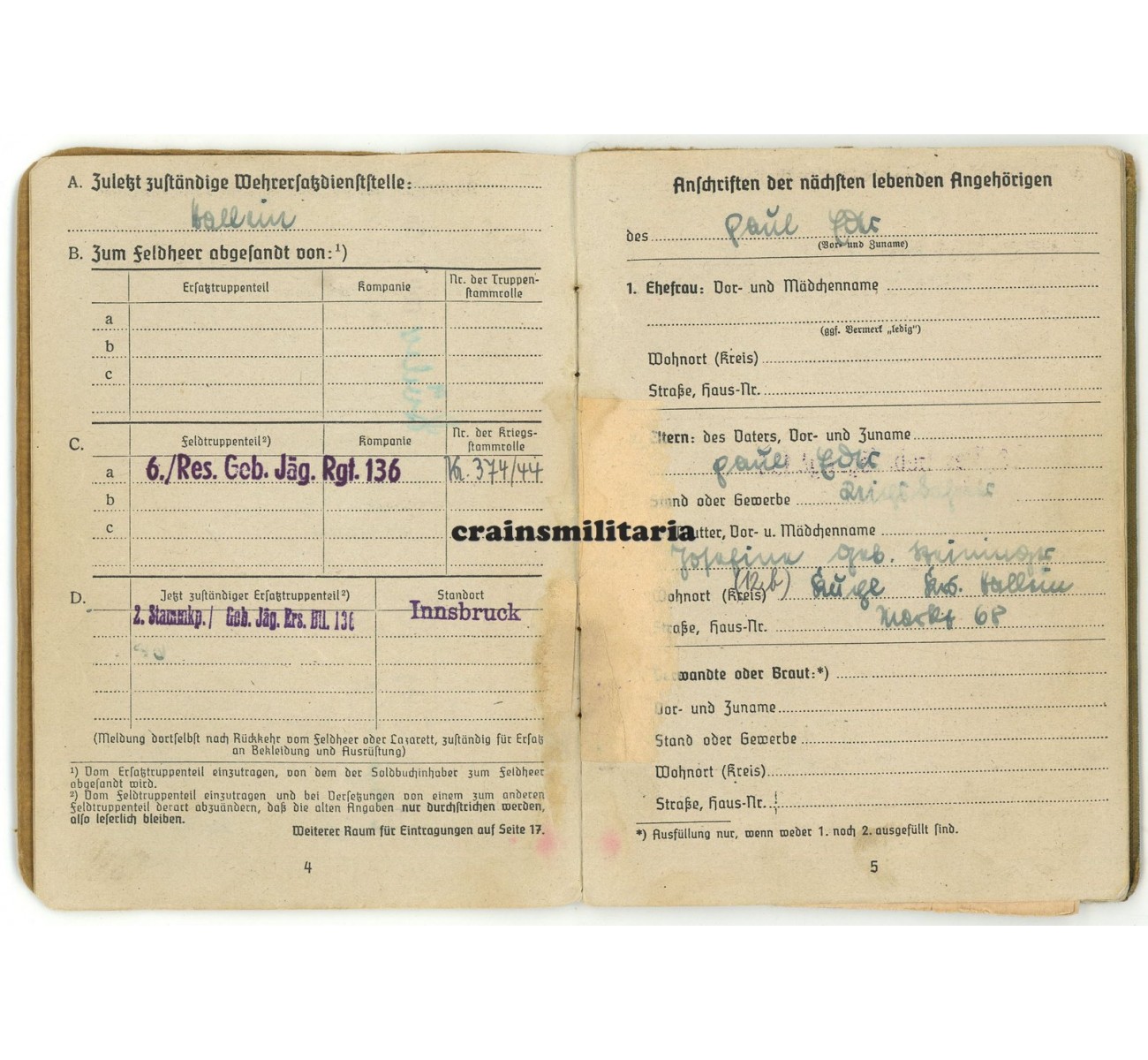 Soldbuch grouping to Oberjäger Paul Eder. This son of an Austrian Reichsbahn employee joined the Wehrmacht around his 18th birthday in early 1944. He was trained as a Gebirgsjäger in Innsbruck, and then forwarded to the 6. Kompanie of Reserve-Gebirgsjäger-Regiment 136 in June 1944. This regiment was deployed in northeast Italy with the 188. Reserve-Gebirgs-Division, and was involved in anti-partisan warfare in the mountain areas of Belluno, Tarvisio and Gorizia.