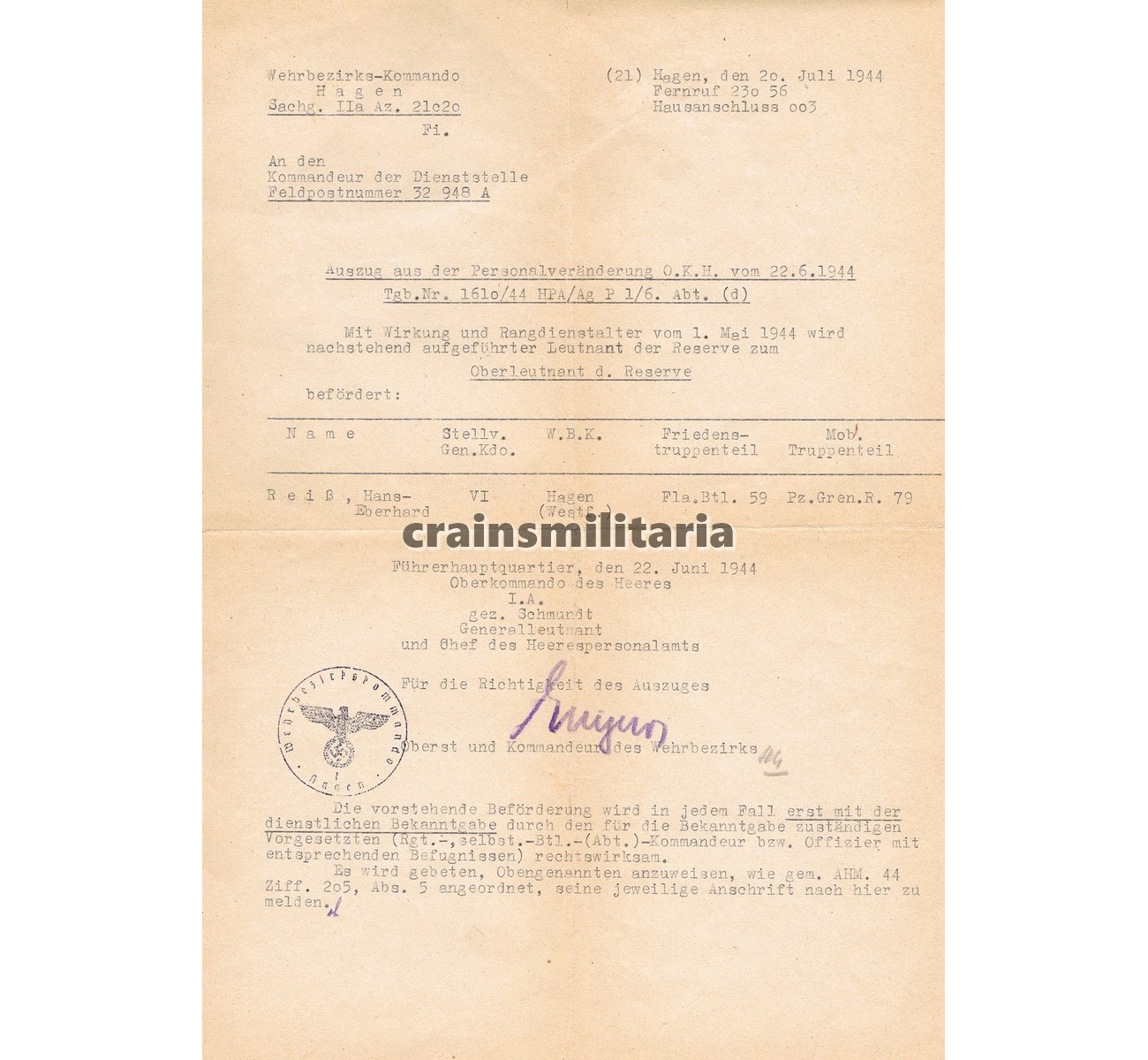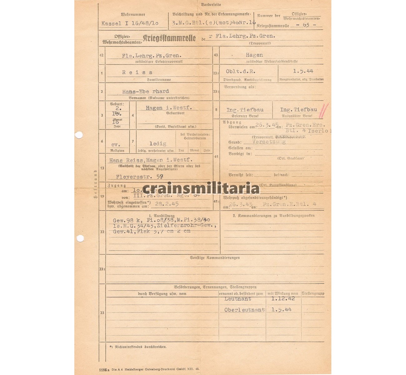 - Document grouping to Oberleutnant Hans-Eberhard Reiss. He was a true combat officer, who was trained on the Luger and Walther pistols, MP40, MG, Heeresflak and most importantly, the "Zielfernrohr-Gew.", sniper rifle, mentioned on his Kriegsstammrolle document. A veteran of the Polish and French campaigns in Fla-Bataillon 46, he fought in the Russian campaign with Panzerjäger-Abteilung 41 of the 6. Panzer-Division in Russia, until his first wound in October 1941. He then pushed into Stalingrad as Heeresflak Geschützführer in Panzergrenadier-Regiment 79 of the 16. Panzer-Division, but was lucky to be sent home mid September 1942. Most of his comrades perished in the Stalingrad pocket, as he joined the rebuilt division again in April 1943 - this time as Heeresflak Kompanieführer with Pz.Gren.Rgt.79. Fought in Italy in 1943 (notably the Salerno landing), where he was awarded the EKII, and then in Russia again, suffering two more wounds. He was awarded the EKII, the PAB, the EKI and two grades of the wound badge.