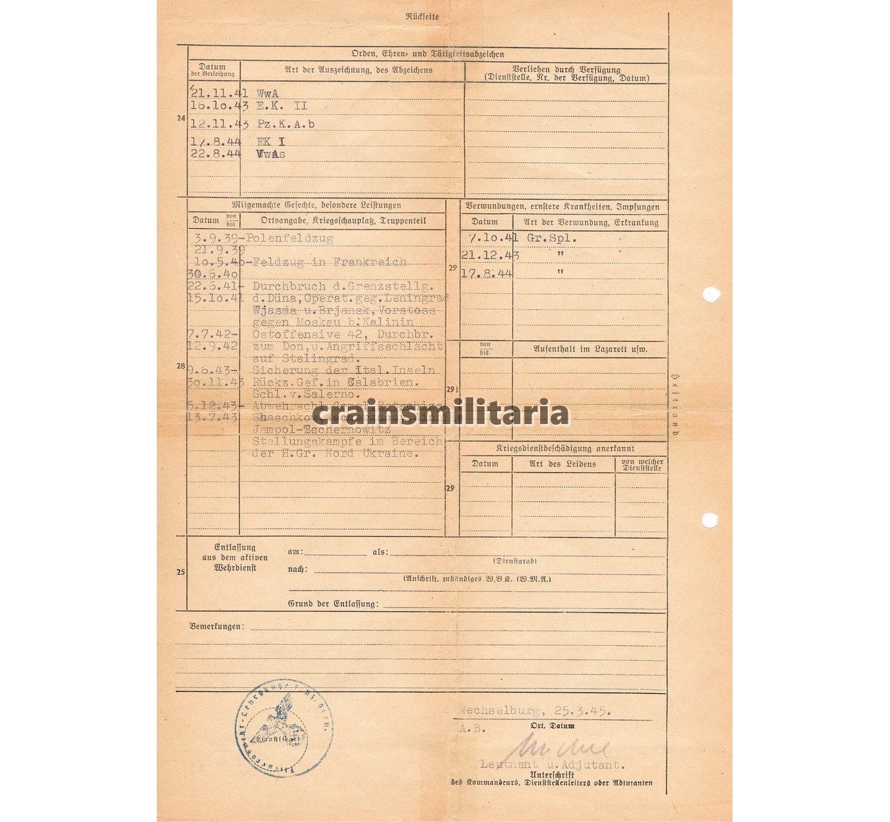 - Kriegsstammrolle document from March 1945, with another detailed summary of his career, including mentioning of the Stalingrad battle and the sniper rifle.