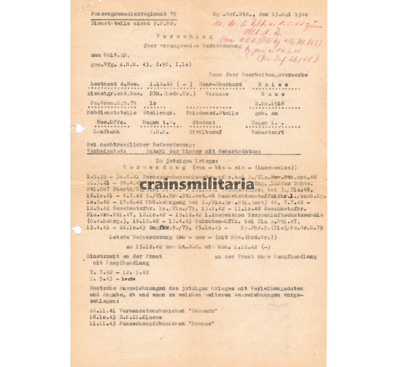 - Vorschlag document for his promotion from 1944, with detailed summary of his career.
