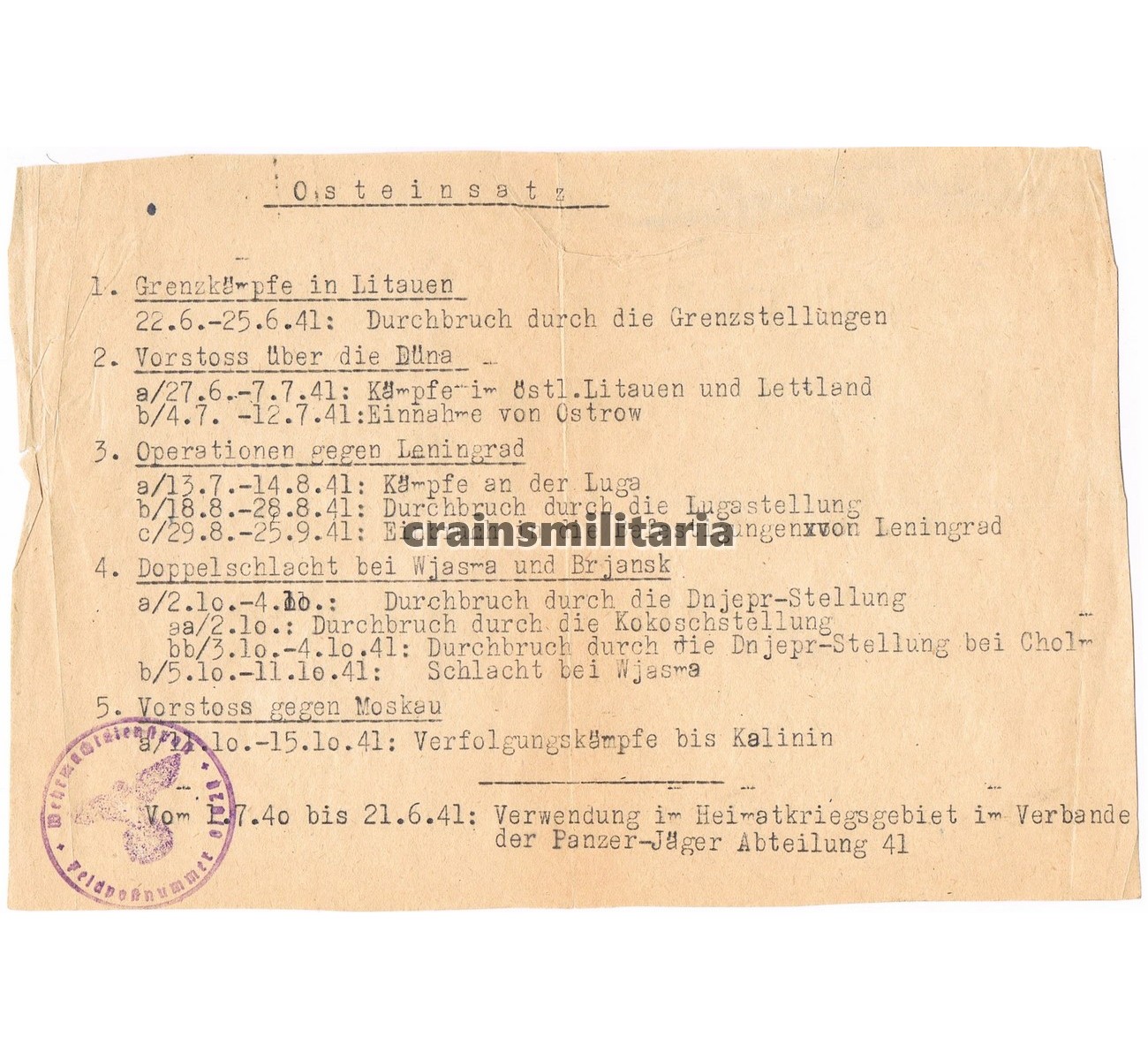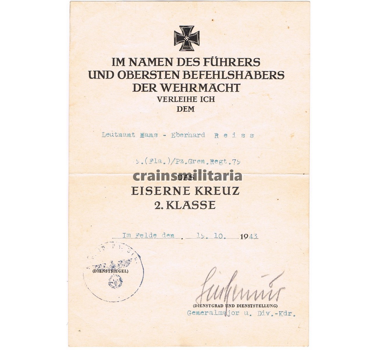 - EKII Award document with original signature by Generalmajor Rudolf Sieckenius, Ritterkreuzträger for the fighting in Italy.