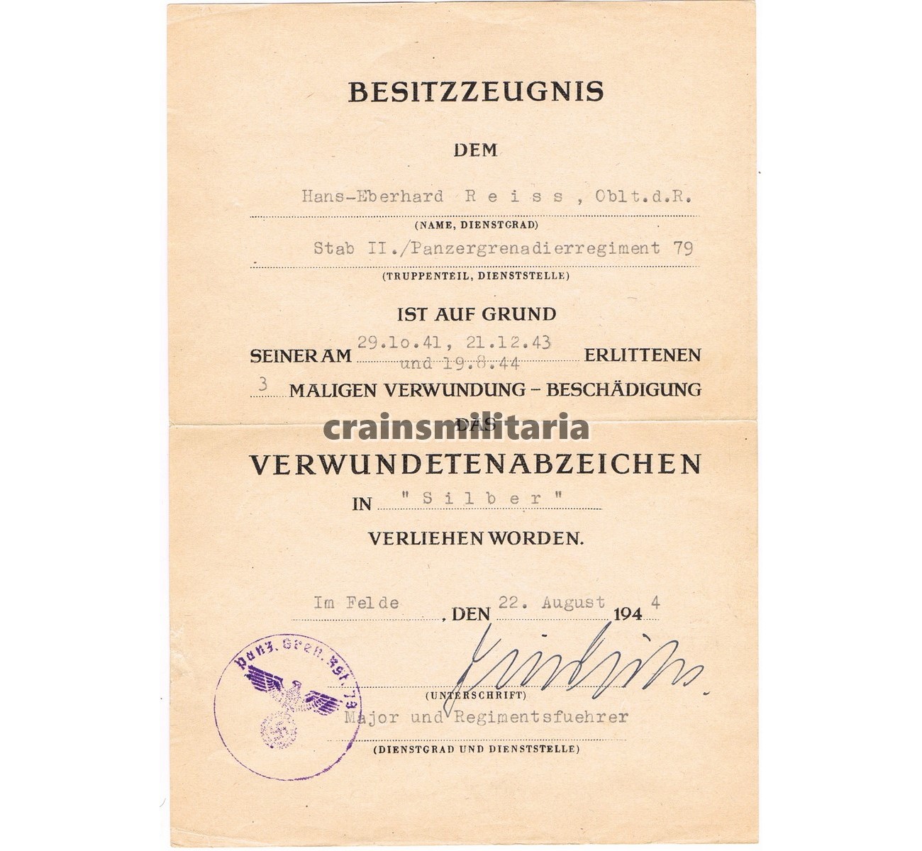 - Verwundetenabzeichen in Silber award document signed by the regimental commander of Pz.Gren.Rgt.79.