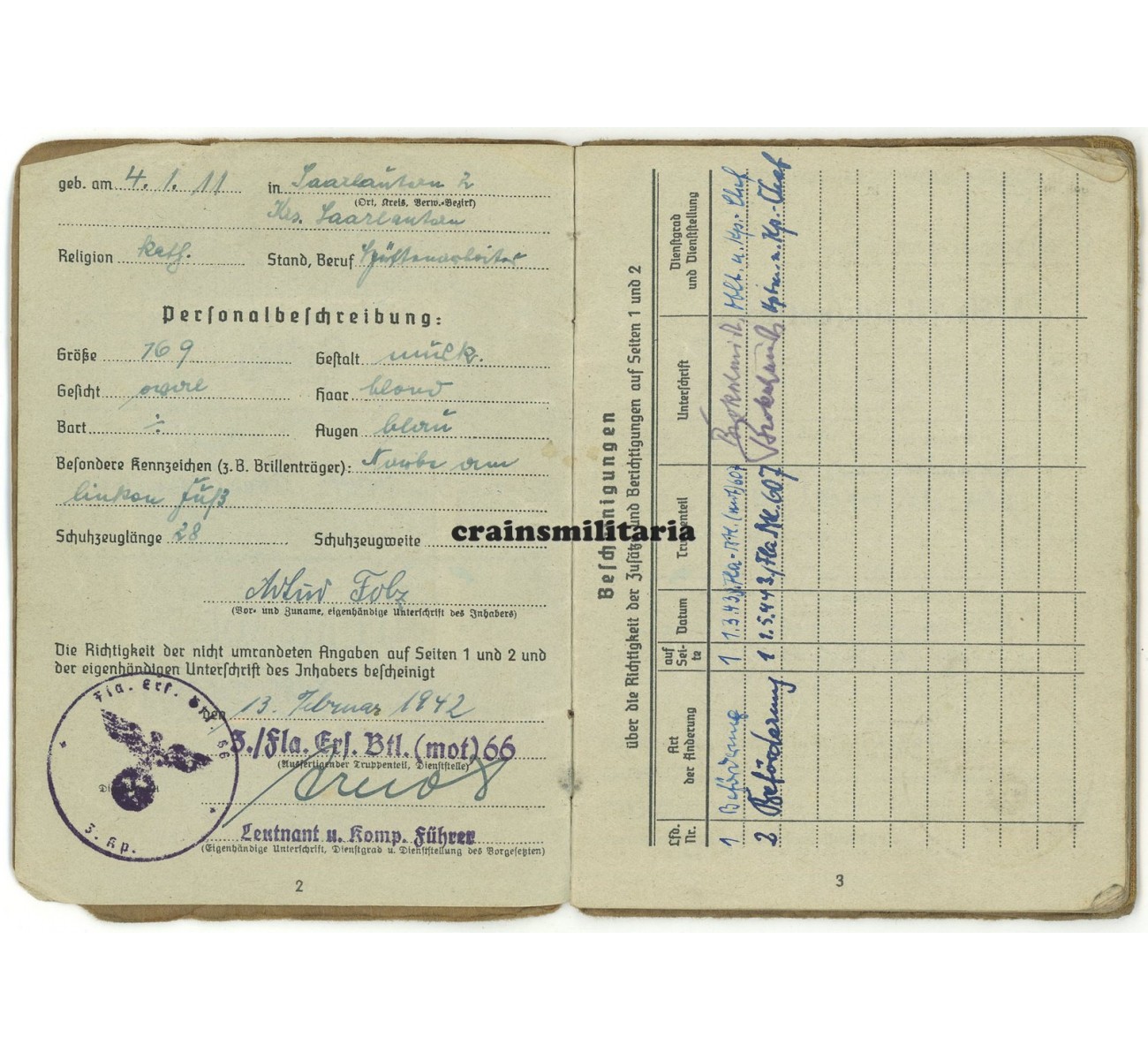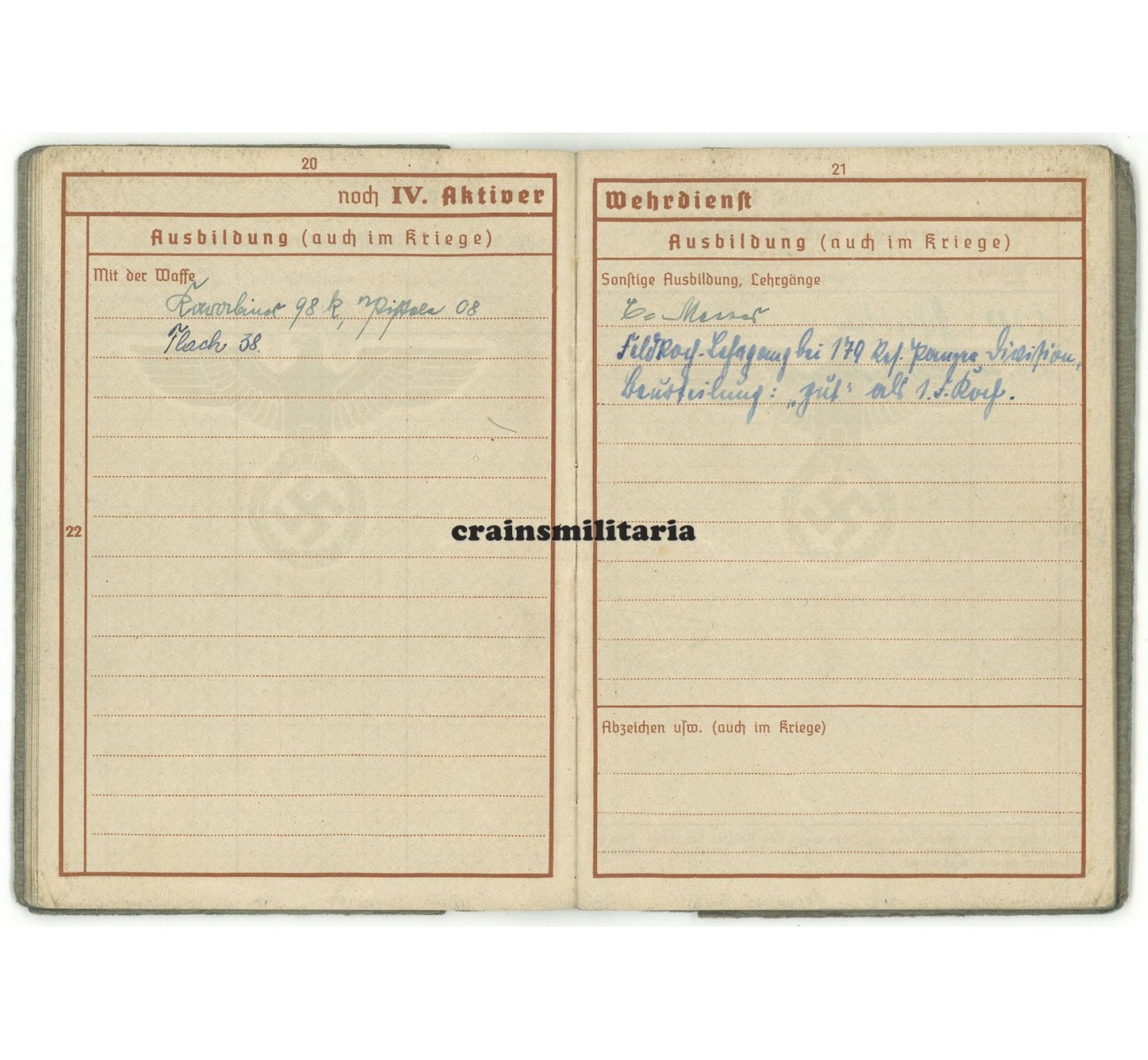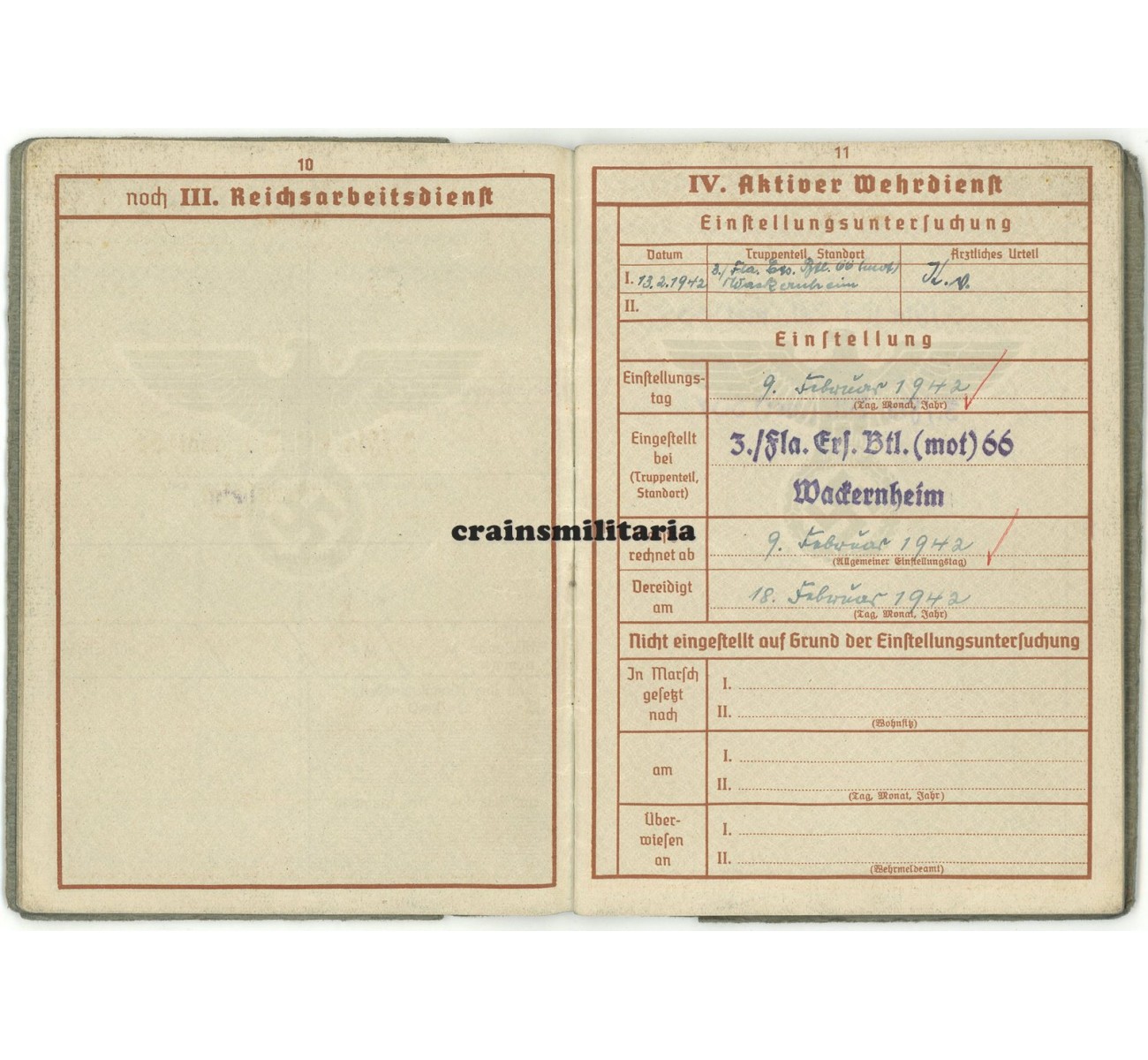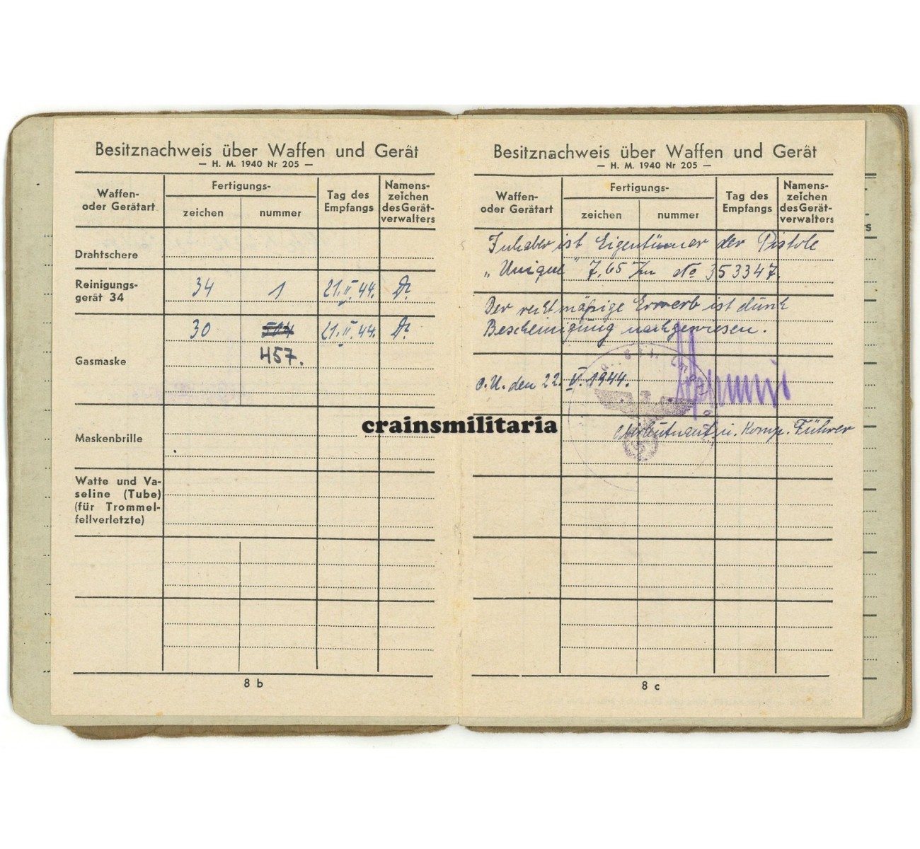 - Soldbuch, first issue from February 1942. Notice the nice 7.65 mm "Unique" pistol entryon page 8c.