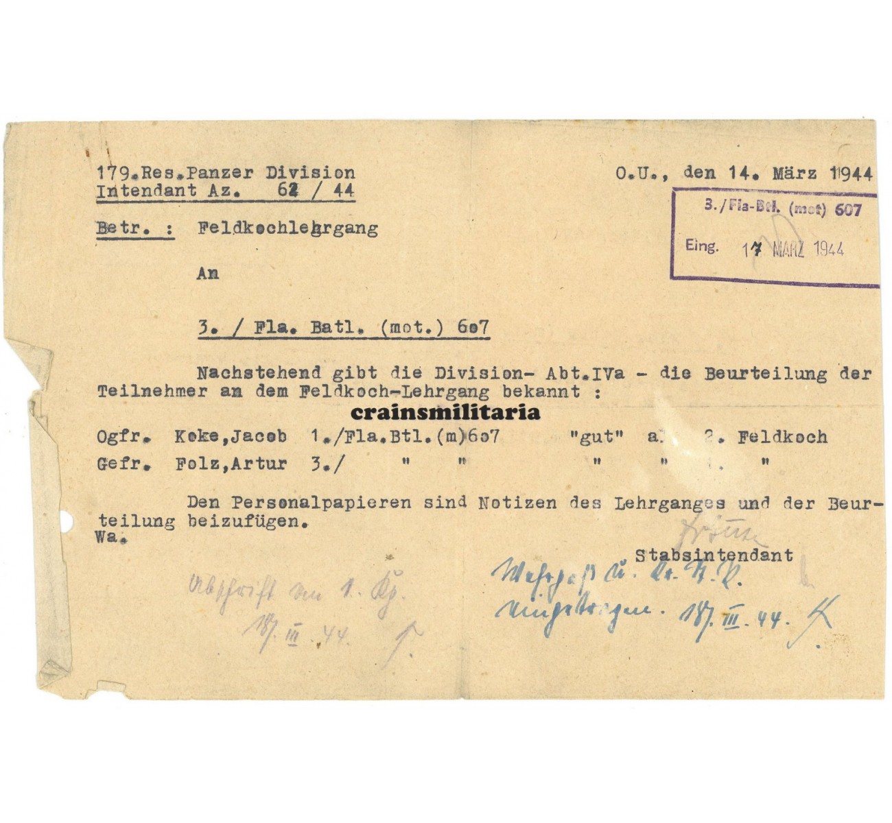 The Bataillon first fought on the central sector of the Eastern Front, and succesfully downed over a dozen Russian airplanes (Il-2, Pe-2, LaGG-5, …) in 1942-'43. Folz was trained as E-Messer and on the Flak 38, but also followed a course as "Feldkoch" (field cook) with the 179. Reserve-Panzer-Division in March 1944. He was awarded the KVKII mit Schwertern in 1945, when his Bataillon was attached to the LXIV. Armeekorps, fighting on the Western Front (Oberrhein area) with the 19. Armee.