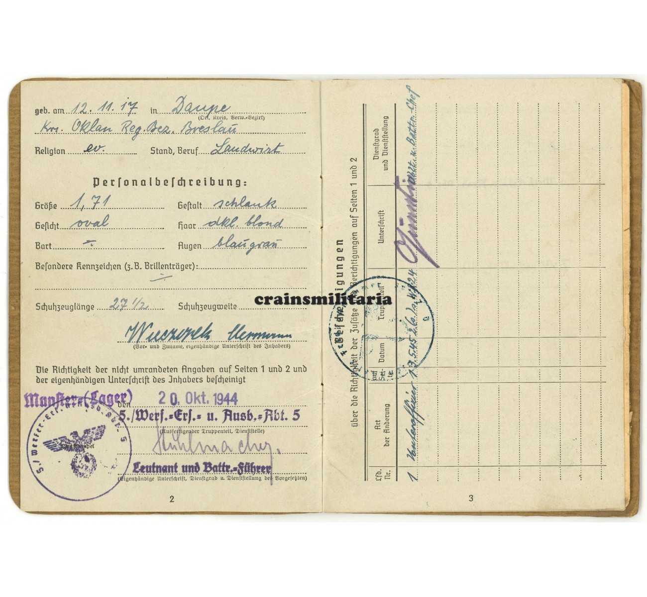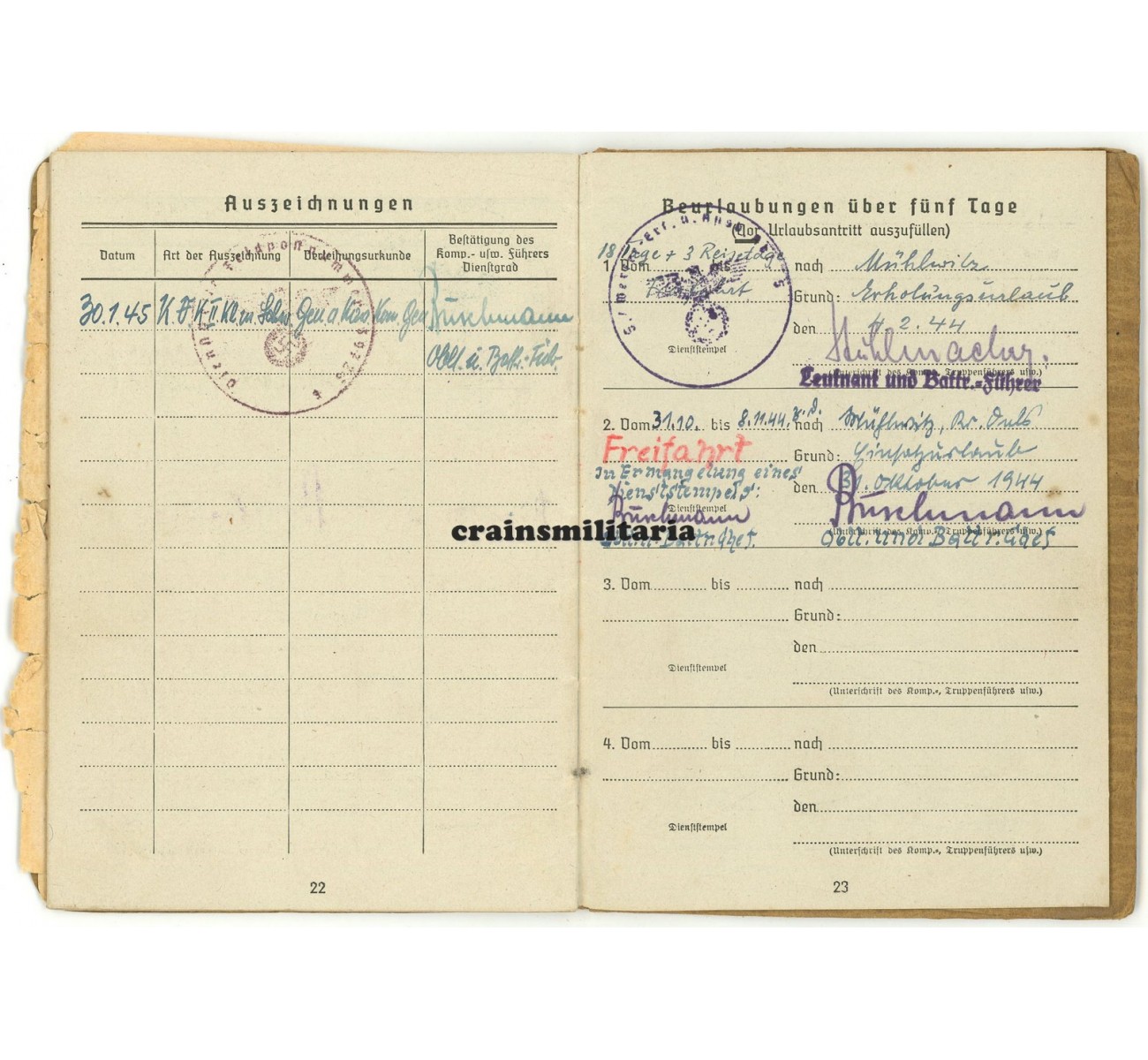 The Soldbuch was issued in October 1944 and is in very good and complete condition. A portrait photo was never inserted, as confirmed in an extra document. The Wehrpass is a first issue from January 1937 and has the cover loose, but is in very good and complete condition.