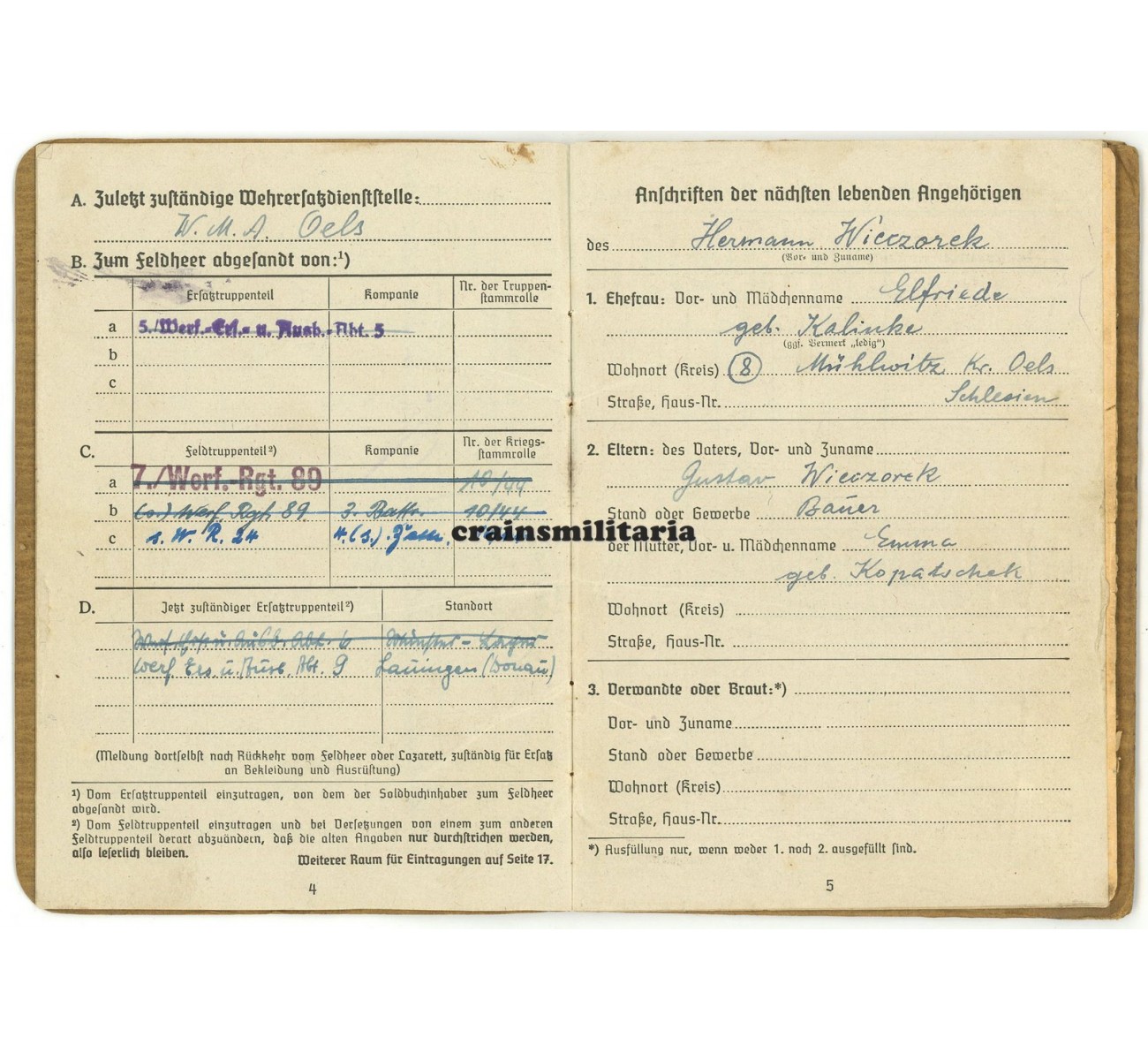Soldbuch and Wehrpass grouping to Hermann Wieczorek. Wieczorek served for over five years as a volunteer with the Luftwaffe, notably at the aiport bases of Alt-Lönnewitz (1939-'42), and then in Norway at Forus (1942) and Vaernes (1942-'44). In September 1944, he was transferred to the Heer, and this is when his Soldbuch was opened.
