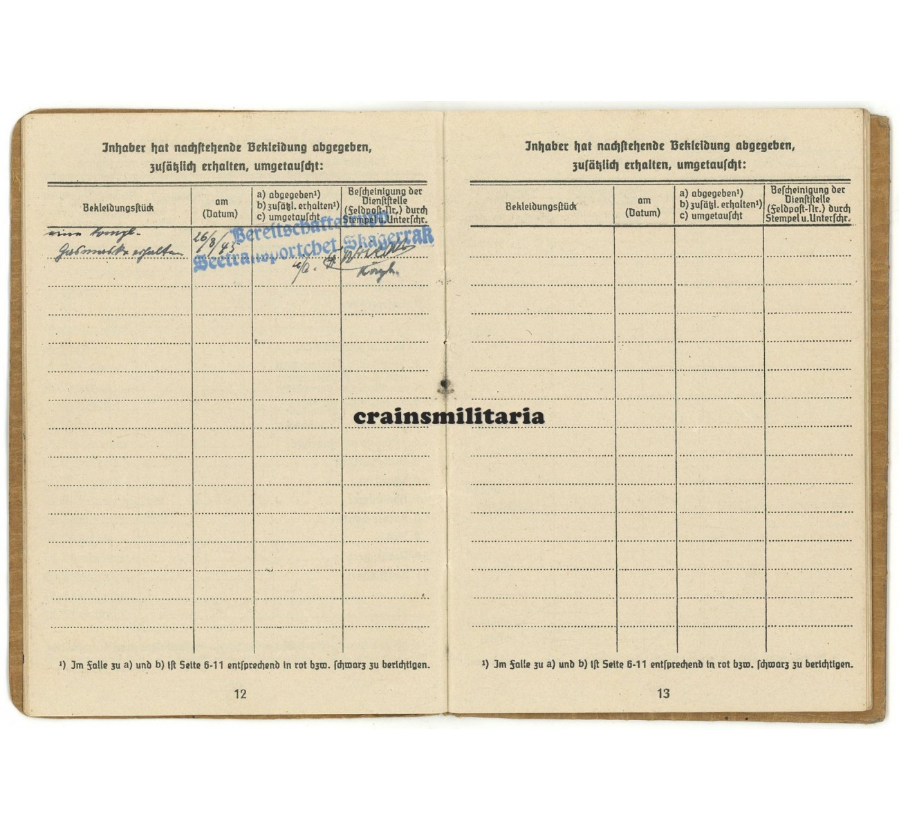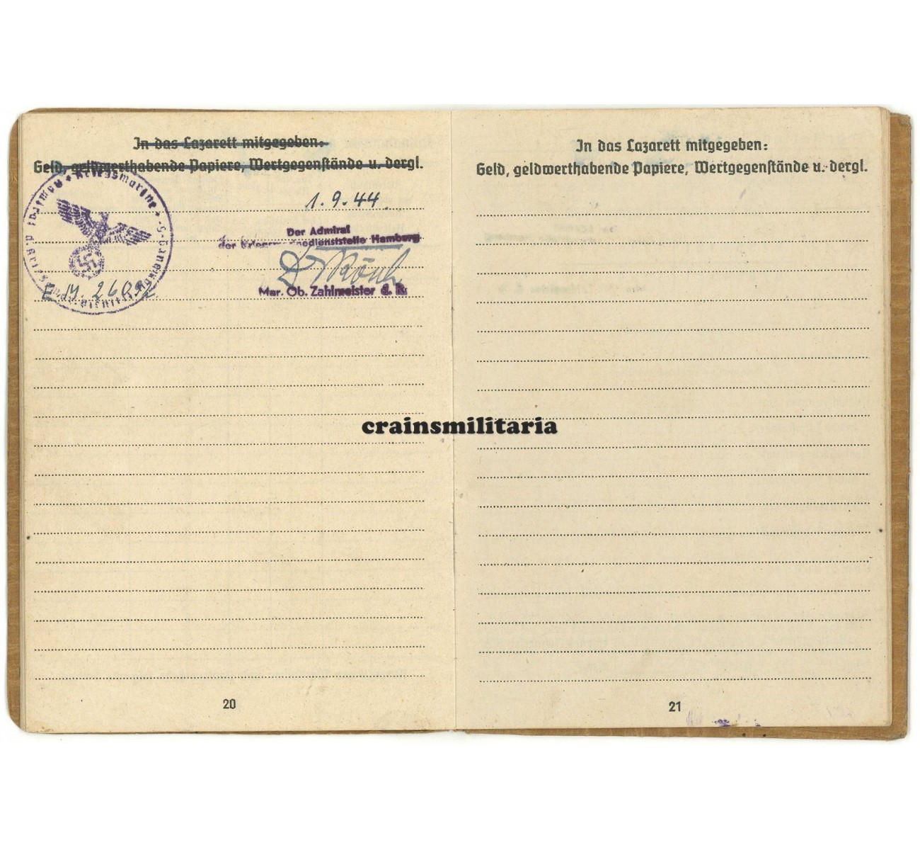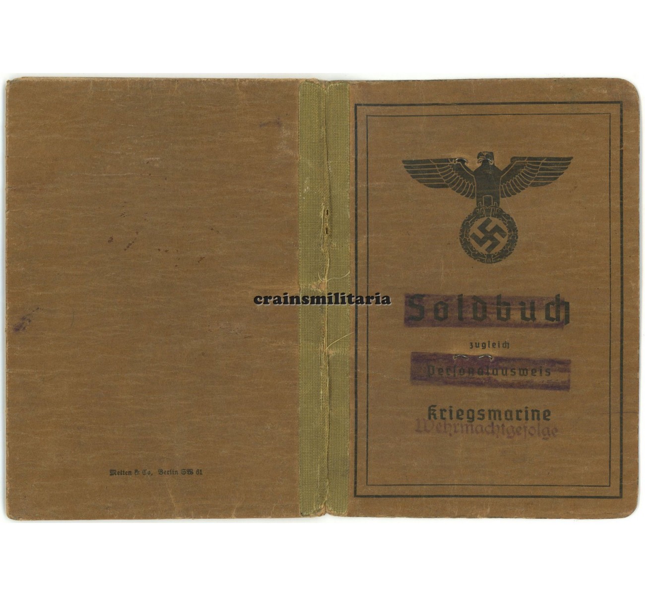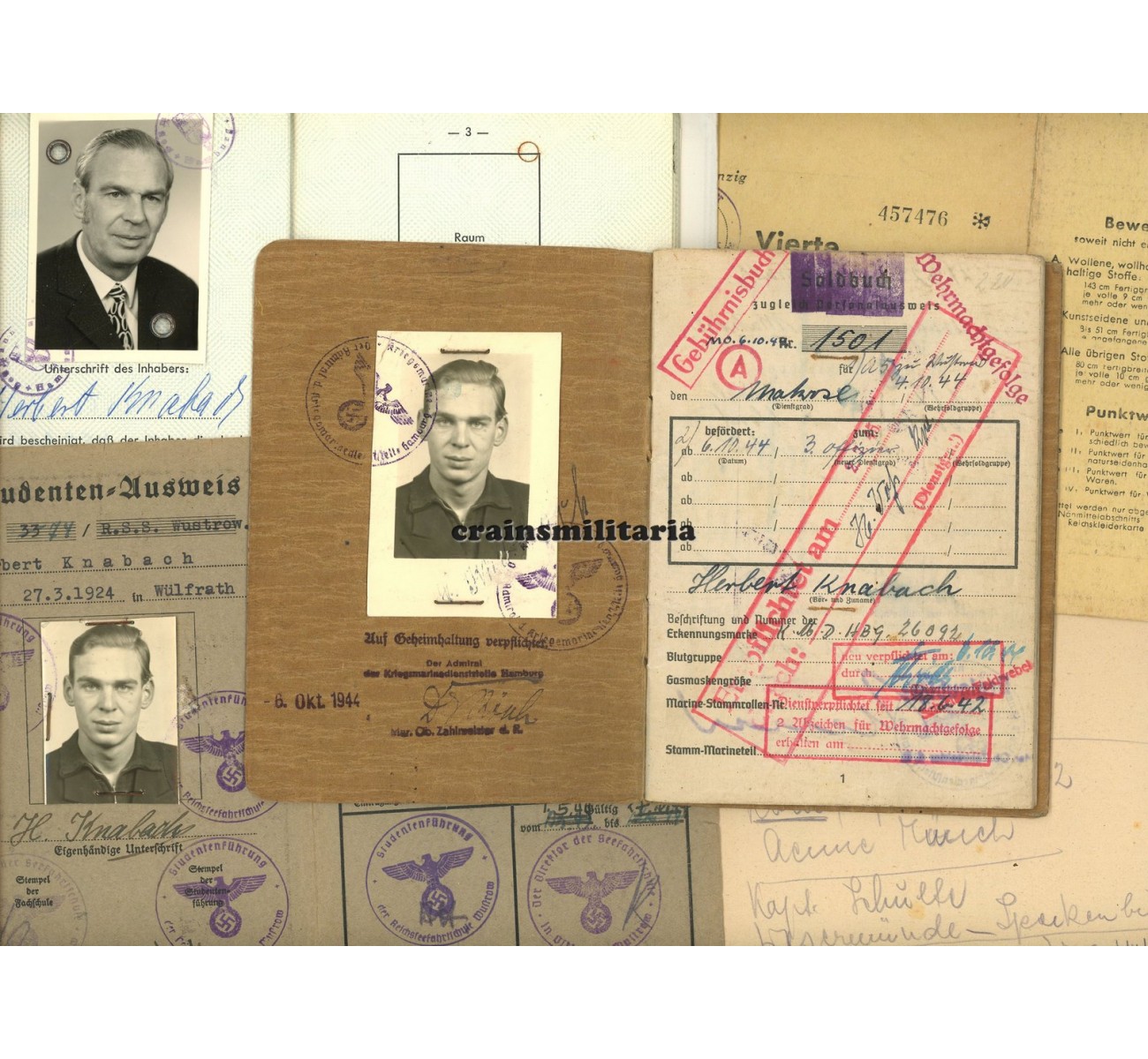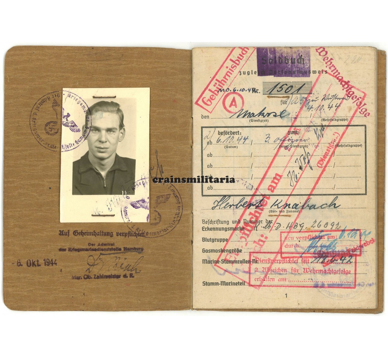 Soldbuch to 3. Offizier Herbert Knabach. First issue from November 1942. Notice the "Soldbuch" title was erased on the cover and page 1 of the Soldbuch, and replaced with stamps "Gebührnisbuch" and "Wehrmachtgefolge". Knabach served on board of a Blockadebrecher, and its personnel were considered cilian auxiliary forces working for the Kriegsmarine.