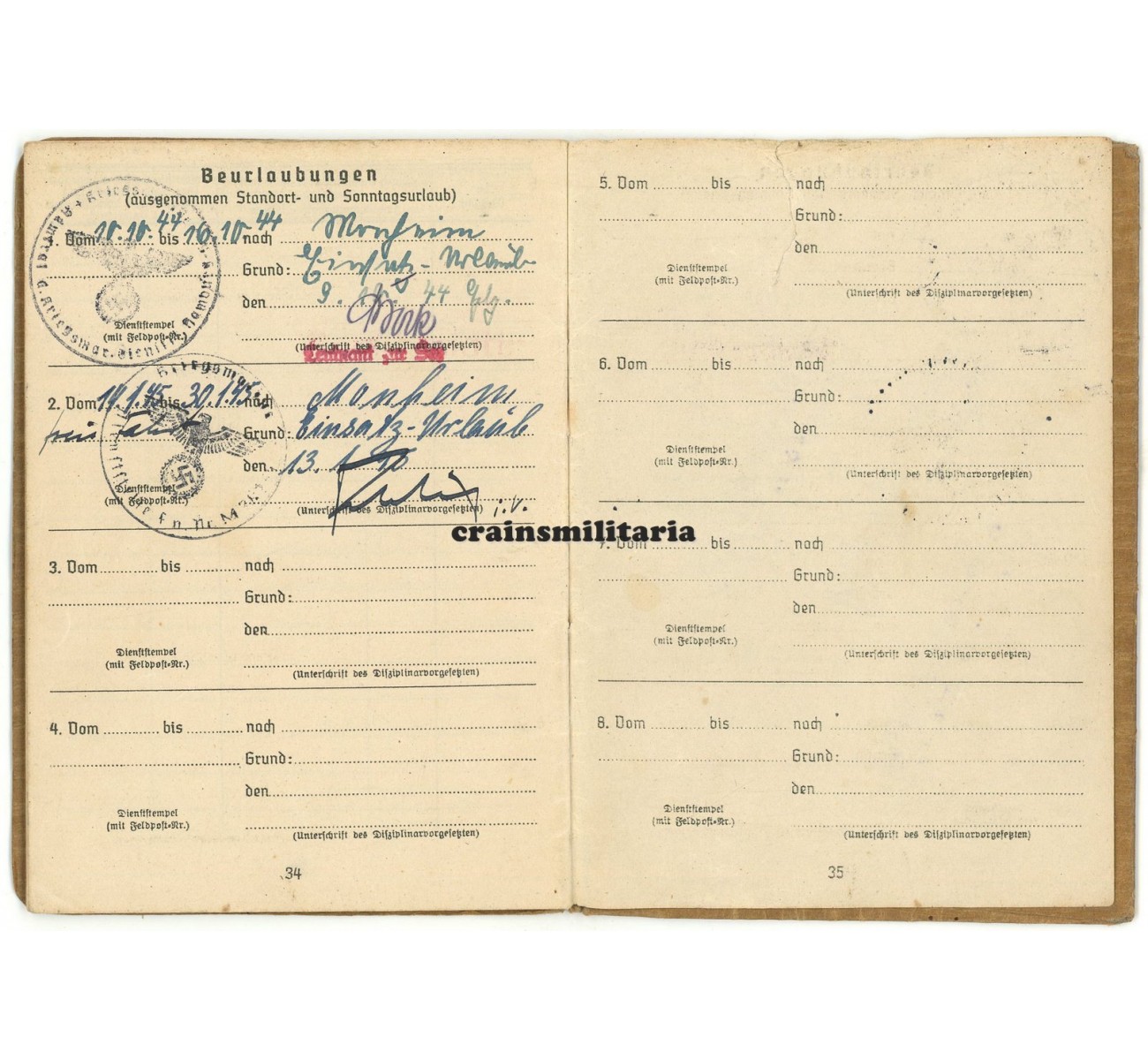 The Soldbuch (Gebührnisbuch) is in excellent and complete condition, including a great portrait photo showing the EKII ribbon on his civilian clothing. It comes with the following extras: