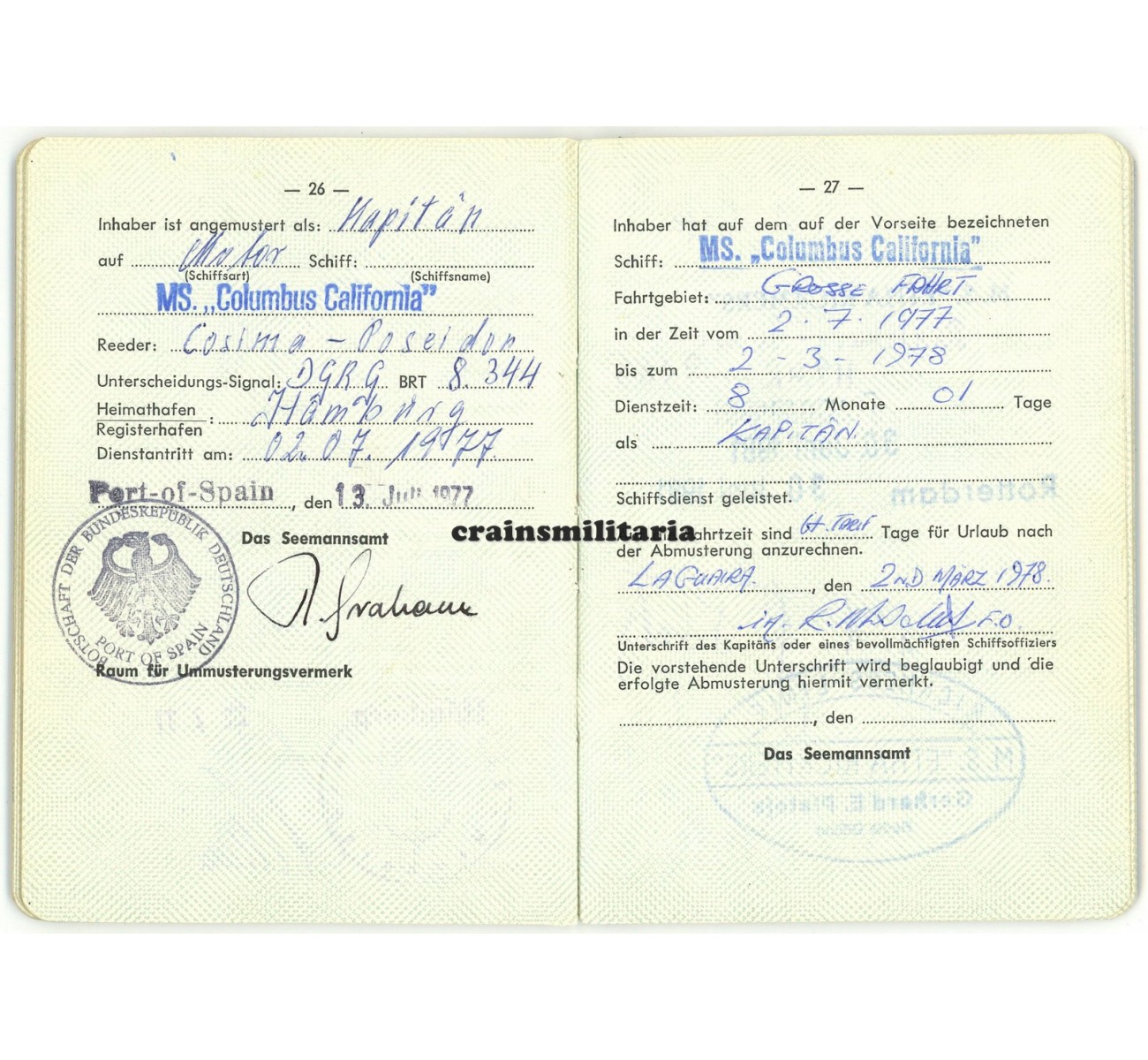 - Seefahrtsbuch, June 1973, with portrait photo and many entries until 1981.