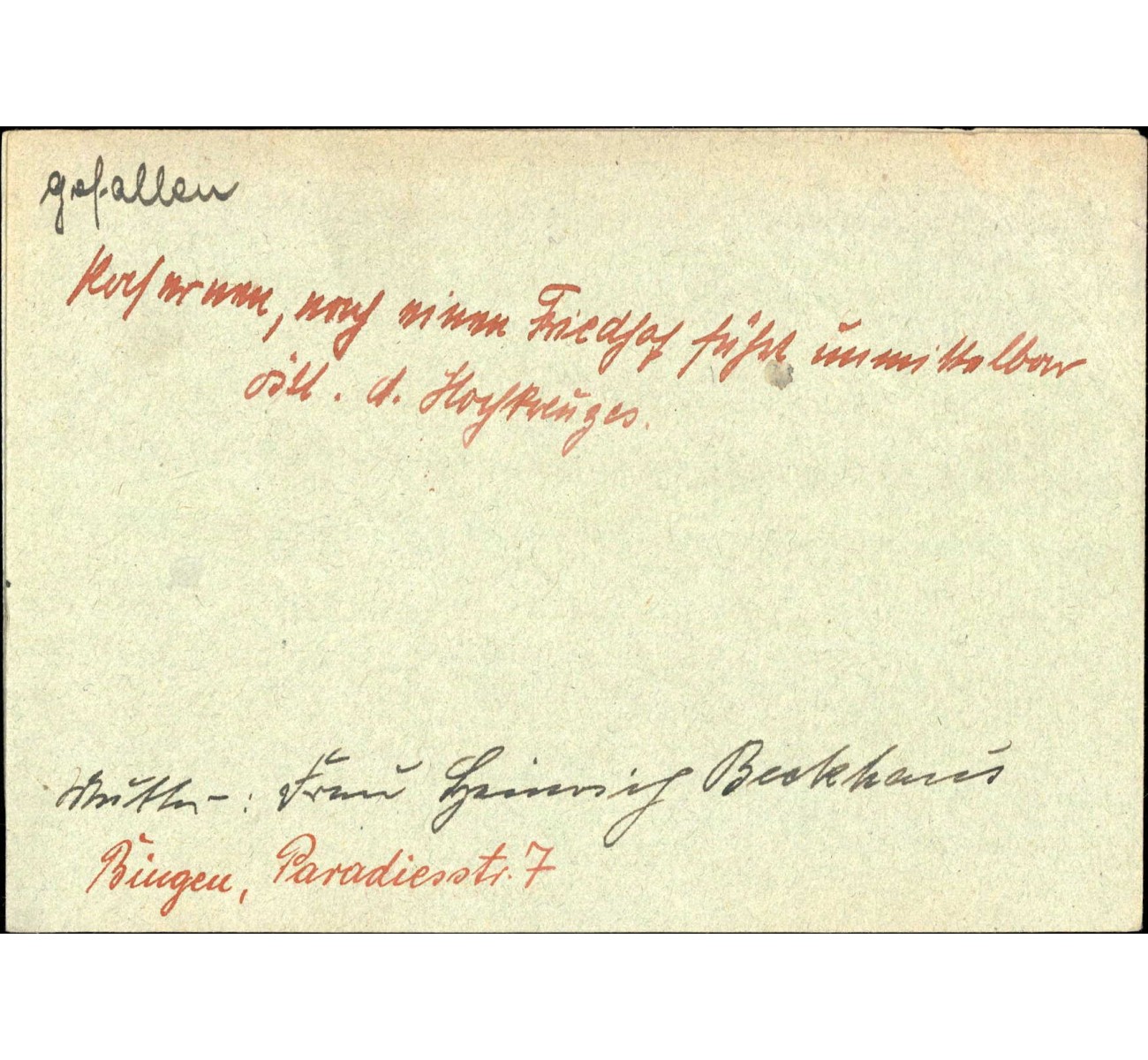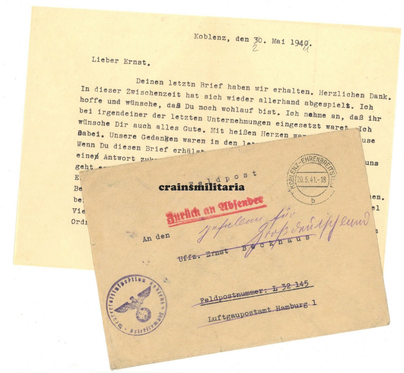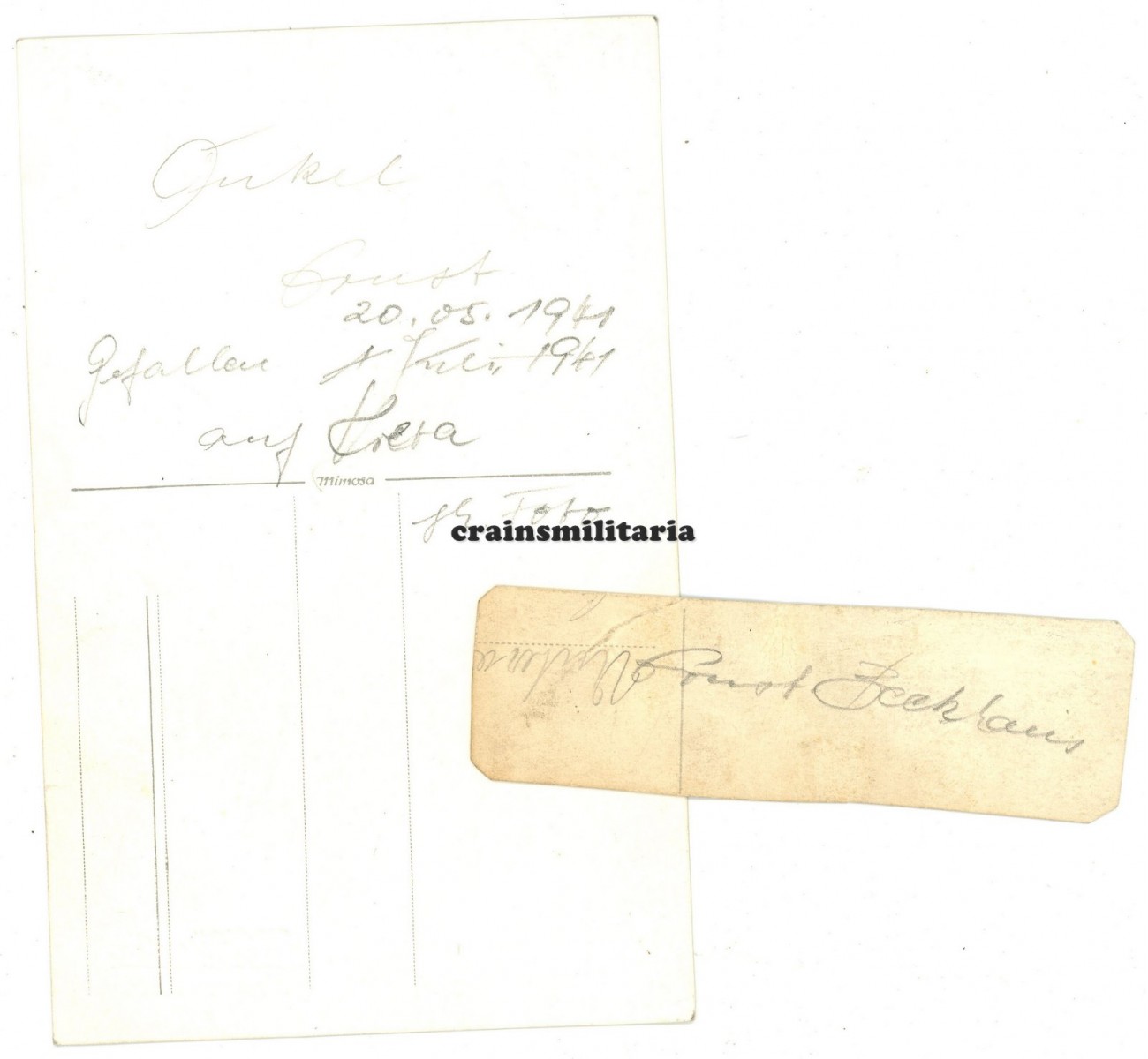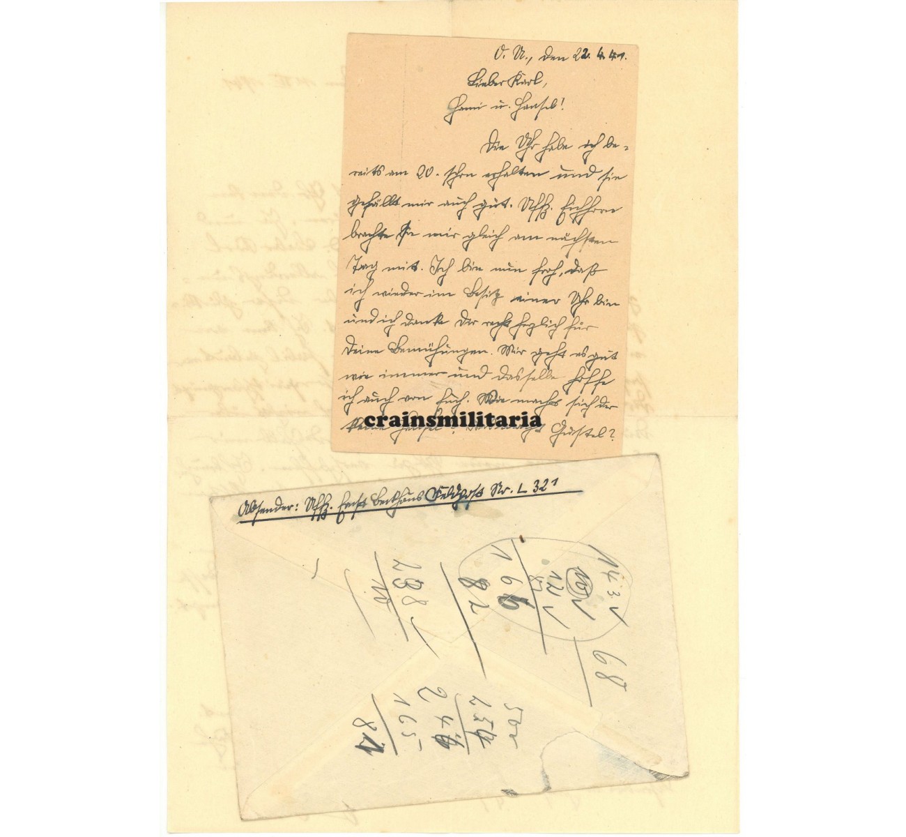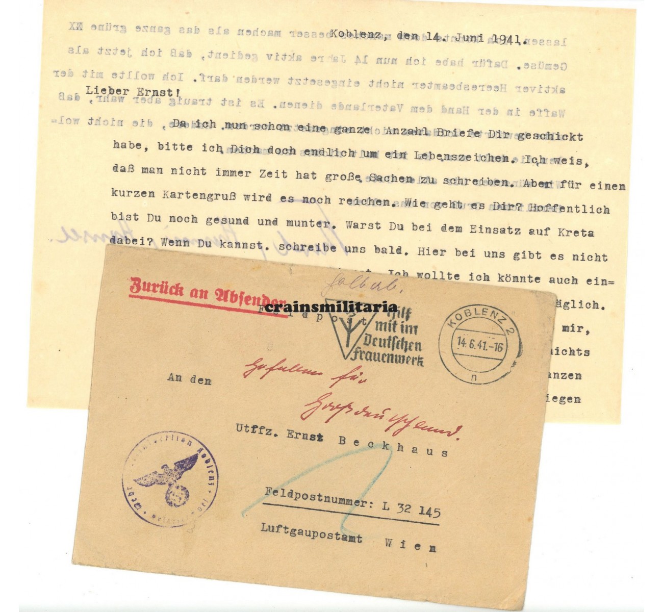 - Two Feldpost letters by his family who were returned with notice "gefallen für Grossdeutschland"; one sent on the exact day of his death, one mid June 1941 when the family was already very woried because of the lack of replies.