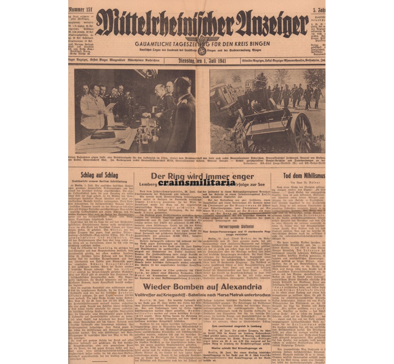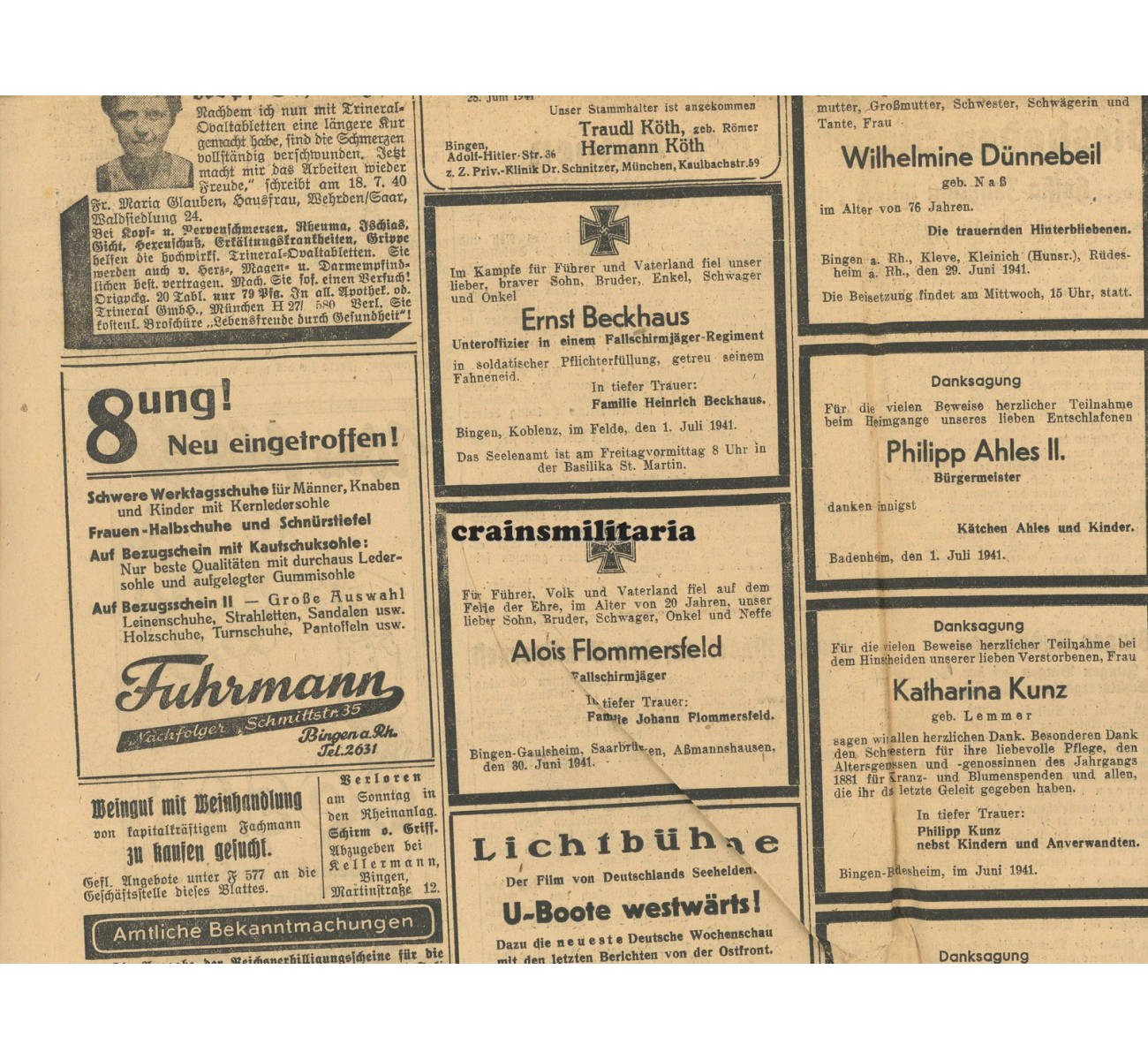 - Newspaper "Mittelrheinischer Anzeiger" from July 1941 including his death announcement.