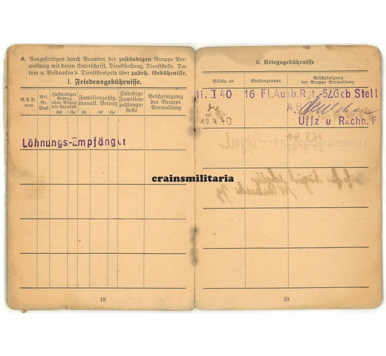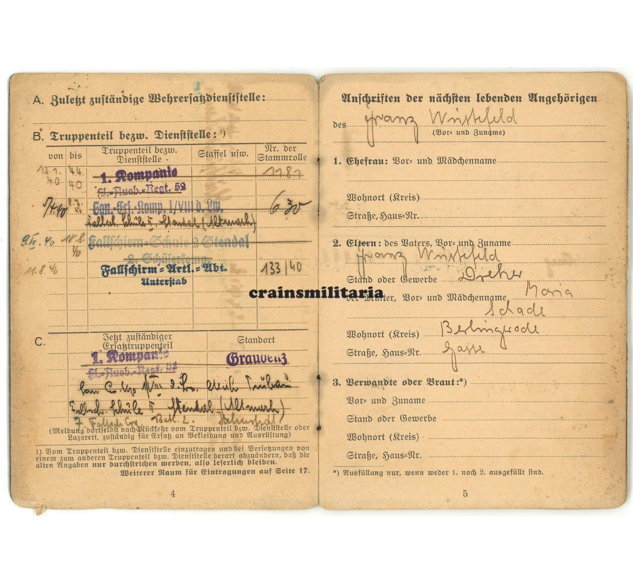Soldbuch to Sanitäts-Soldat Franz Wüstefeld. First issue from January 1940, with an uncommon purple cover. After basic Luftwaffe training, Wüstefeld received a three month course as a medic in April-July 1940, before entering paratrooper training at Stendal. He was then forwarded to the Fallschirm-Artillerie-Abteilung in August 1940. He received a new FJ Erkennungsmarke by this unit on 23rd of September 1940, but this is the last dated entry in the Soldbuch.