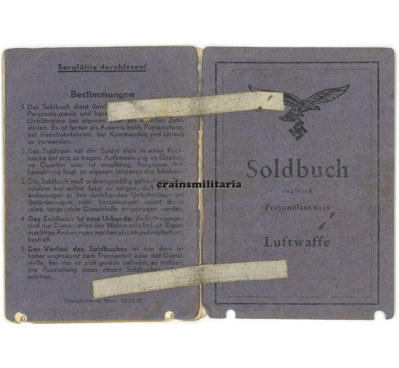 - Soldbuch, Zweitschrift issue from March 1943, with many interesting entries including Fliegerkopfhaube, Fallschirmjäger uniform and Tarnjacke. Pages are loose, page 17/18 is missing.