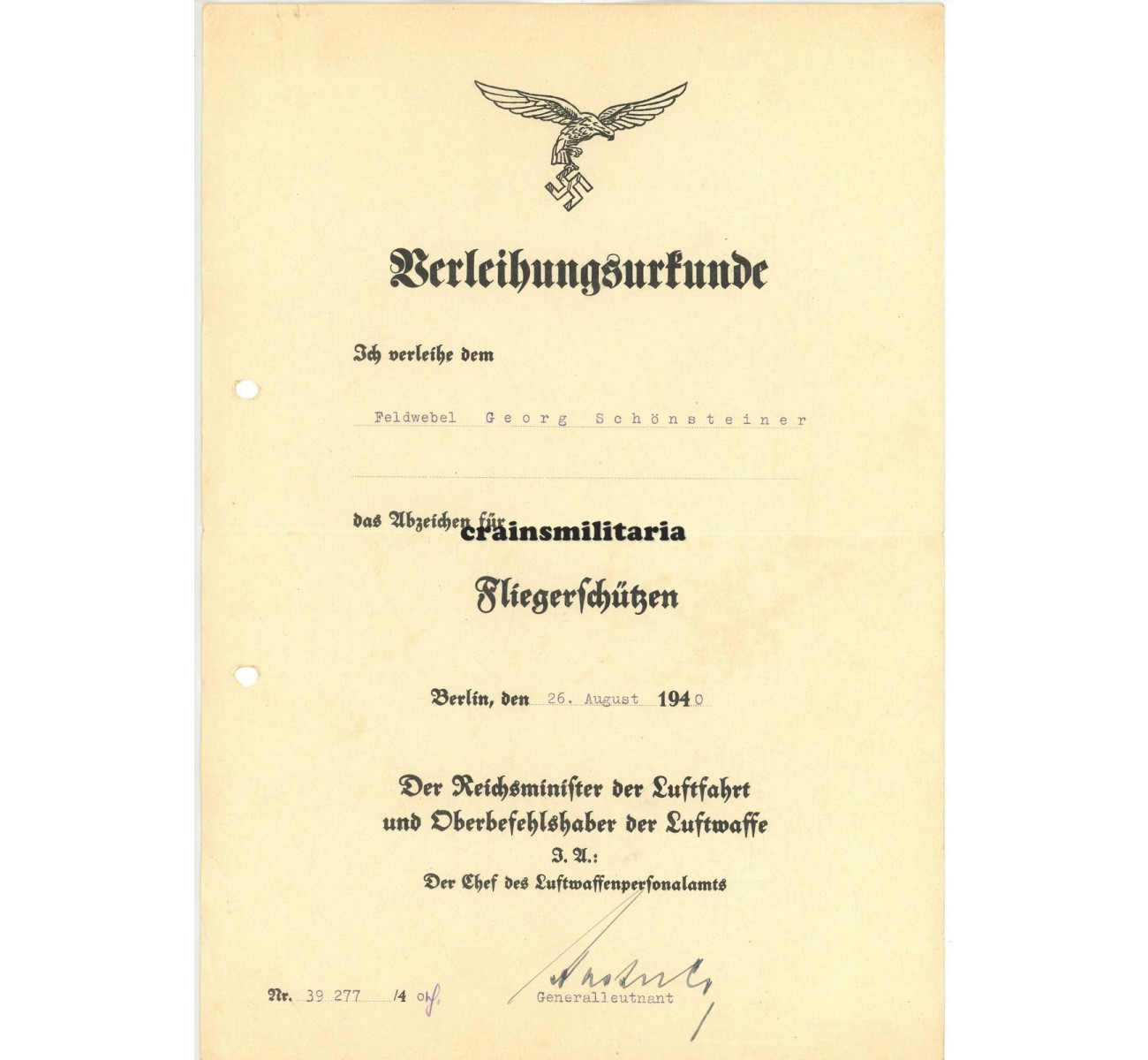 - Award document for the Fliegerschützen-Abzeichen,August 1940, hand signed by Generalleutnant Gustav Kastner-Kirdorf, DKiS winner.
