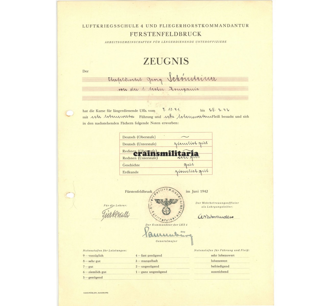- Zeugnis by the Luftkriegsschule 4 in Fürstenfeldbruck, June 1942, hand signed by Generalmajor Herbert Sonnenburg.