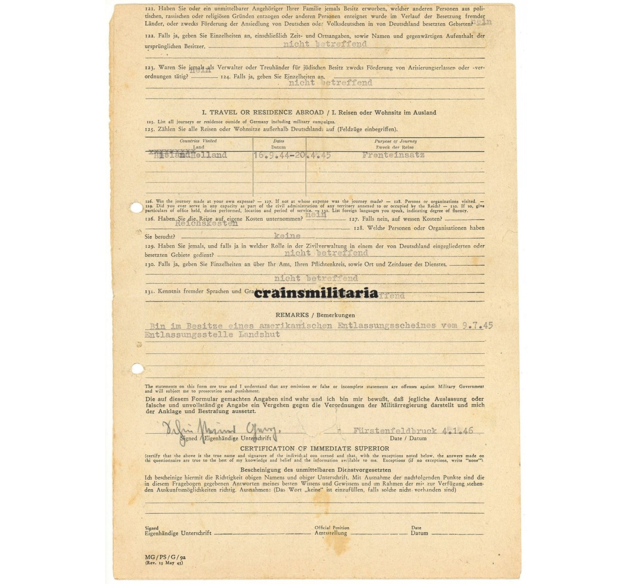 - Six page "Fragebogen" by the Military Government of Germany, with complete summary of his civilian and military careers. Notice the "Fronteinsatz - Holland - 16.9.44 - 20.4.45" entry.
