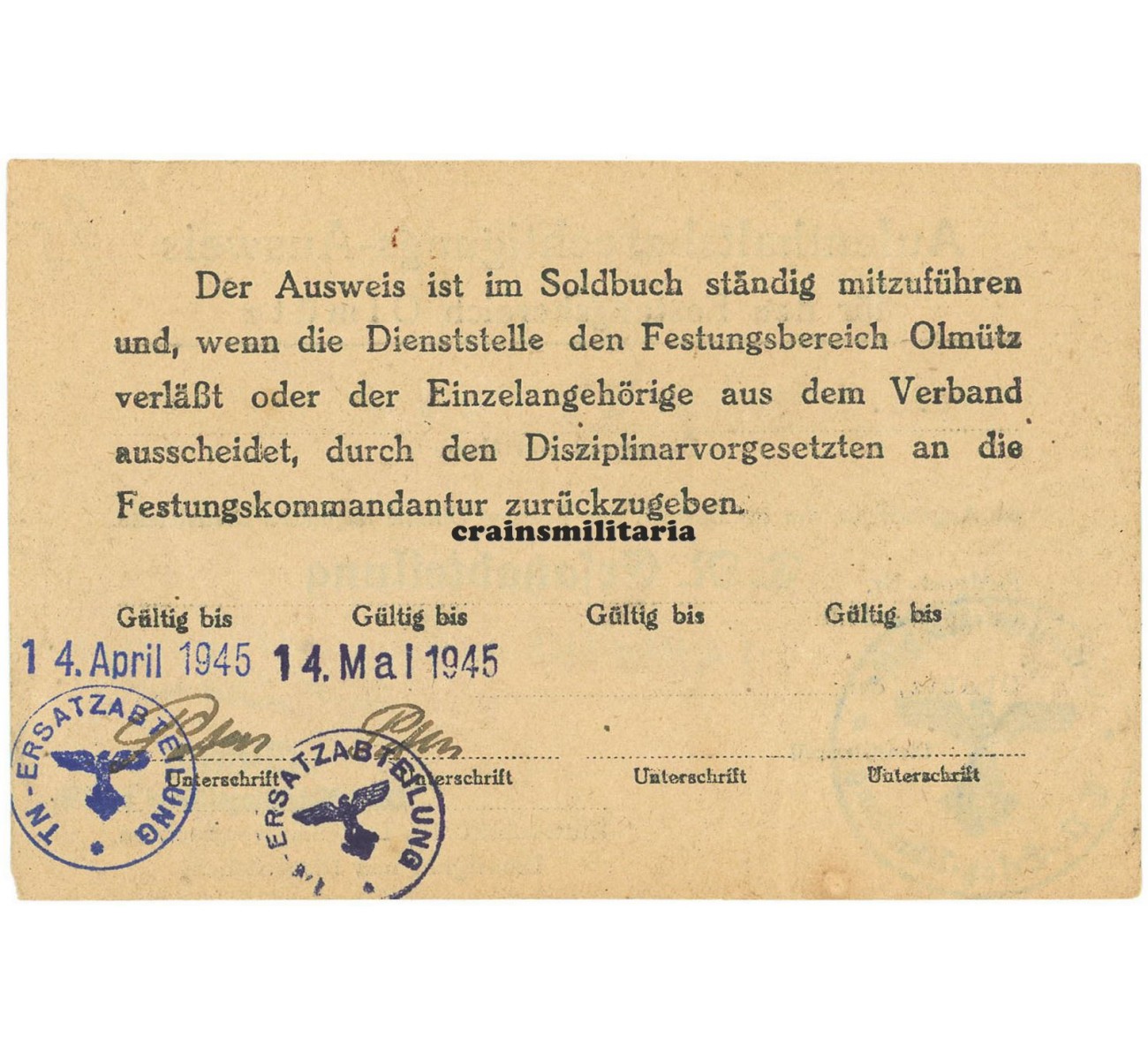 Arriving back at Olmütz following his retreat from France, Klimke ended up in the Festung Olmütz, as can be seen by the nice "Aufenthaltsbereichtigungs-Ausweis" from mid March 1945, which was prolonged for an extra month mid April 1945. This ID permitted him to enter the area of the Olomouc fortress. The front lines moved close to the city, but the Russians only marched in on 8th of May 1945.