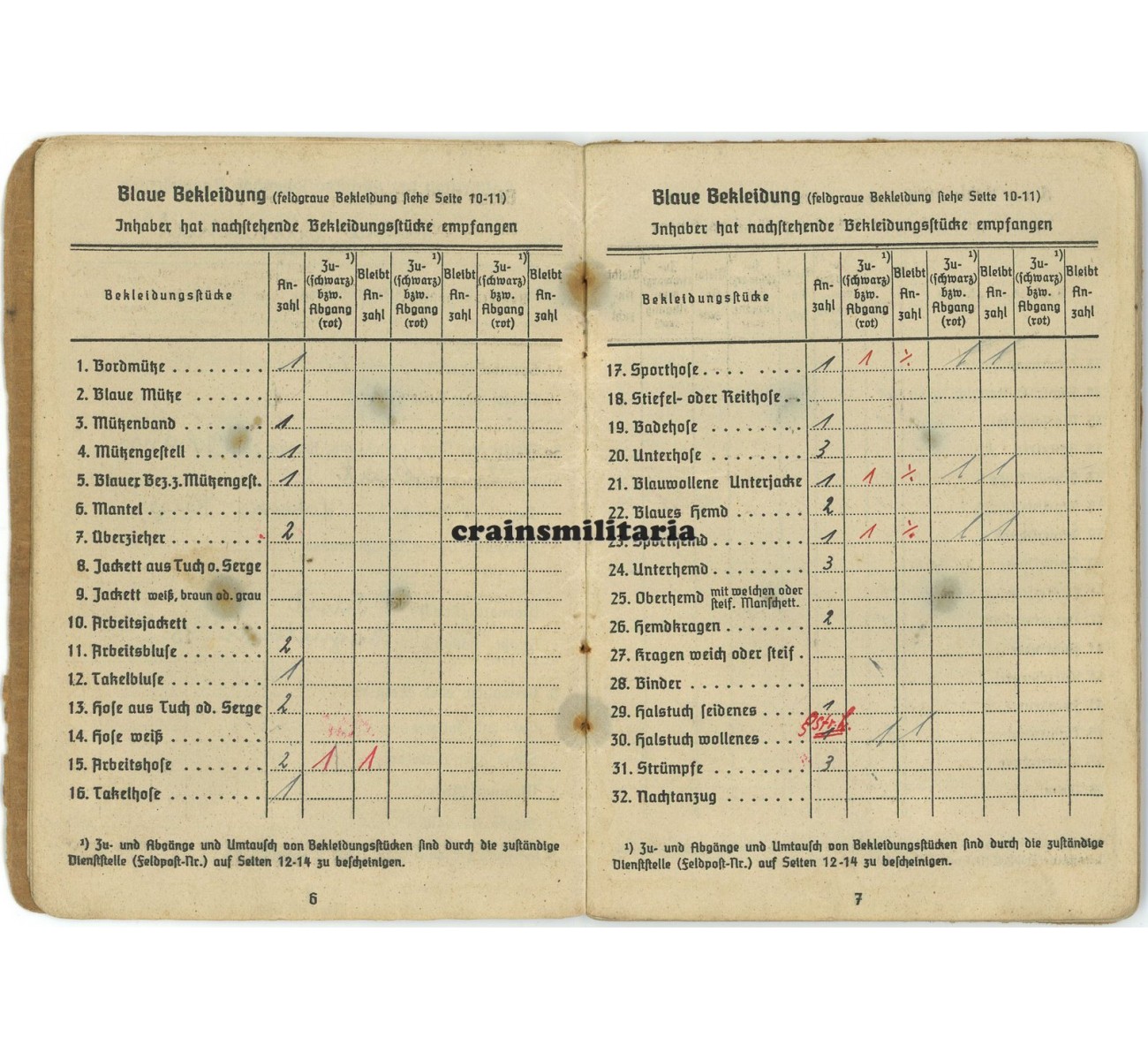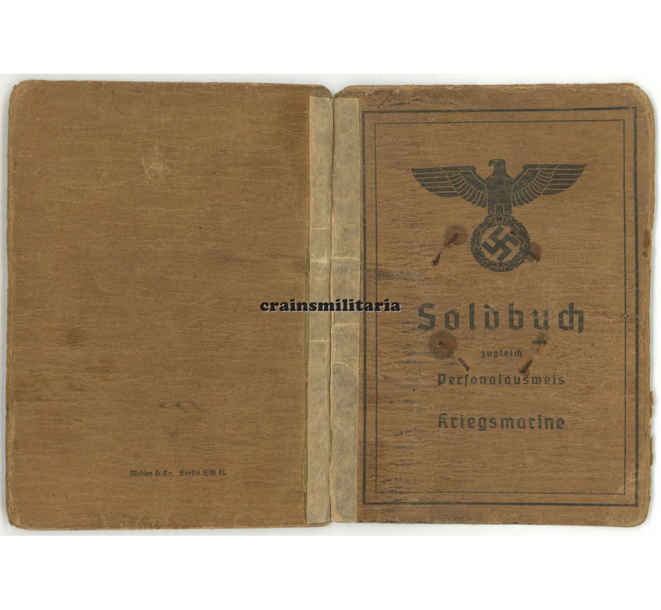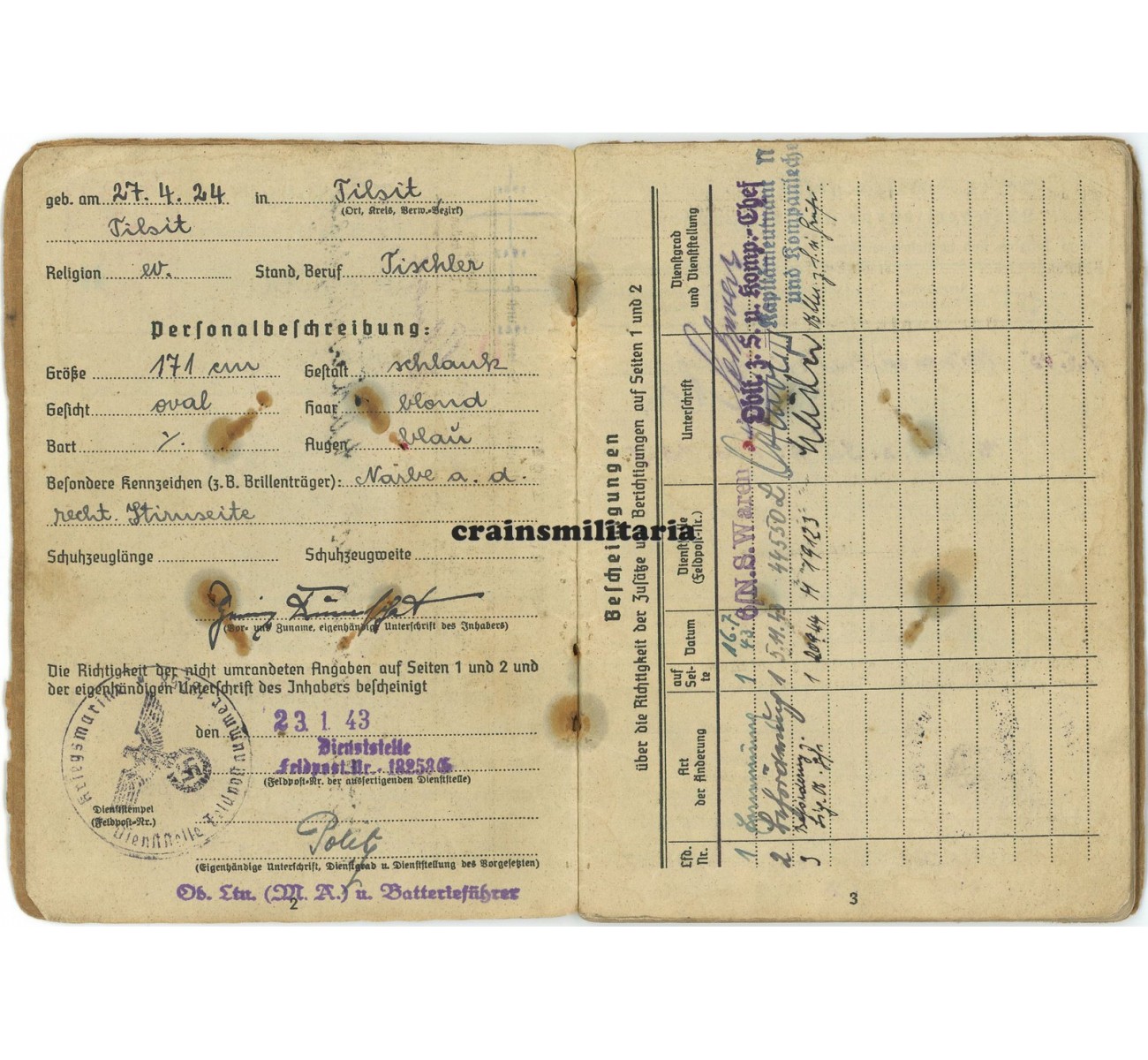 Soldbuch to Signal-Obergefreiter Heinz Dumschat. First issue from January 1943. Born in the Eastern Prussian city of Tilsit, Dumschat served in a number of various Kriegsmarine units. He was first with the 7. Batterie of Marine-Artillerie-Abteilung 509 based on the Atlantikwall in Frederikshavn, Denmark in 1943. After training as a radio man with the Nachrichtenschule Waren (Müritz), he was sent to Greece with the Marine-Nachrichtenoffizier Athen. Here, he moved to Marine-Artillerie-Abteilung 603, protecting the Greek coast.