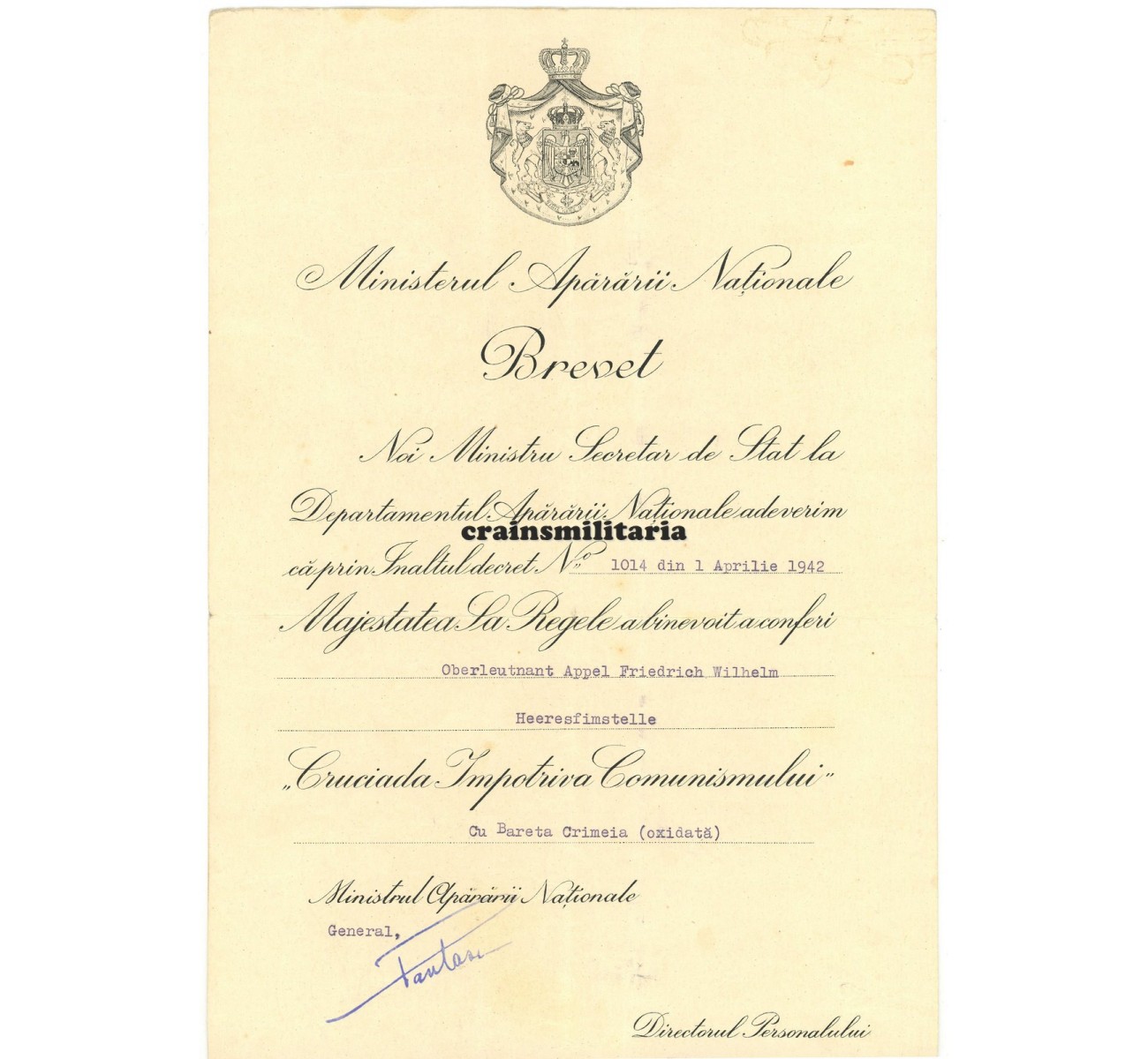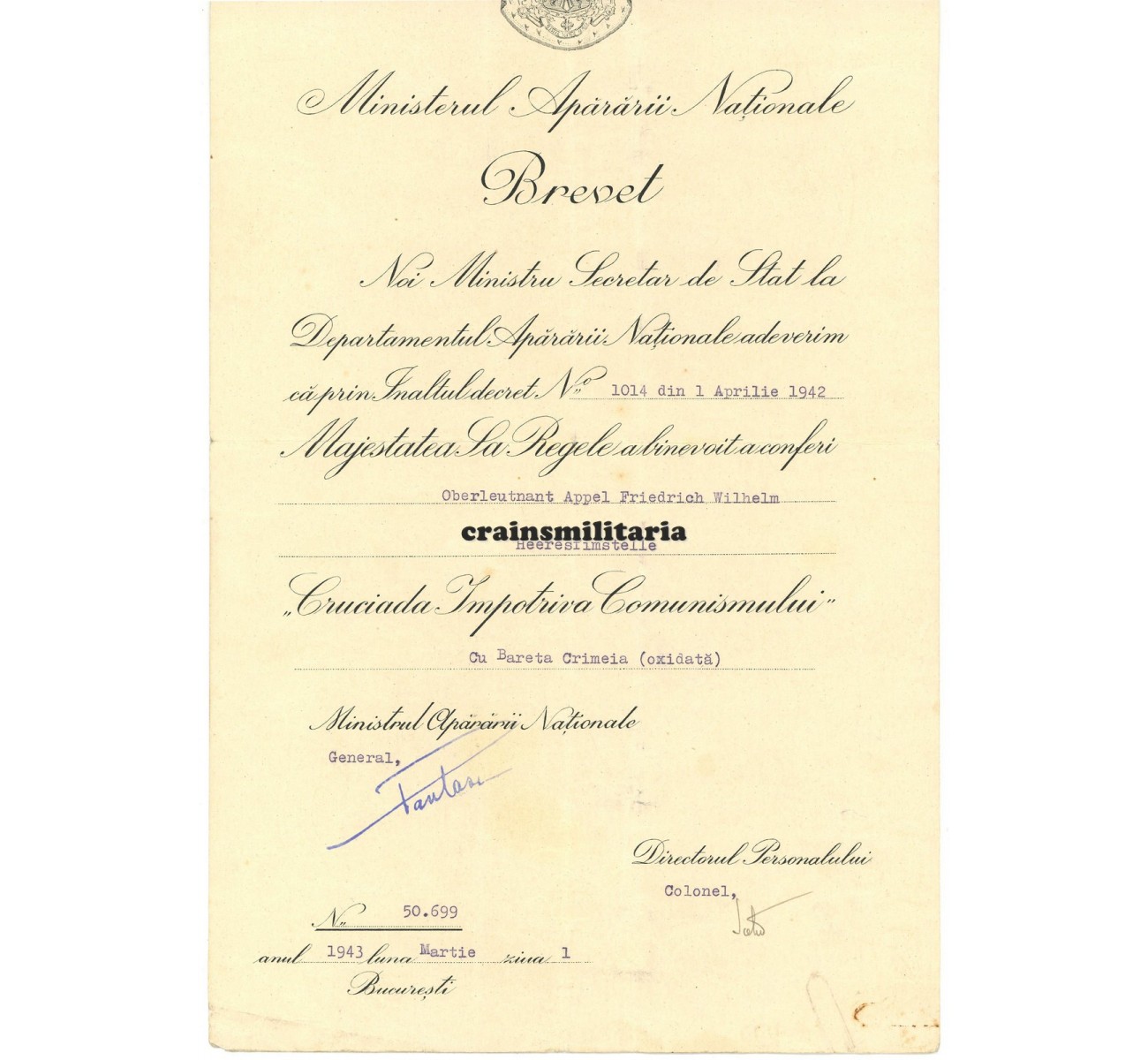 - Award document for the Romanian Crusade against Communism award with "Krim" bar, 1943.