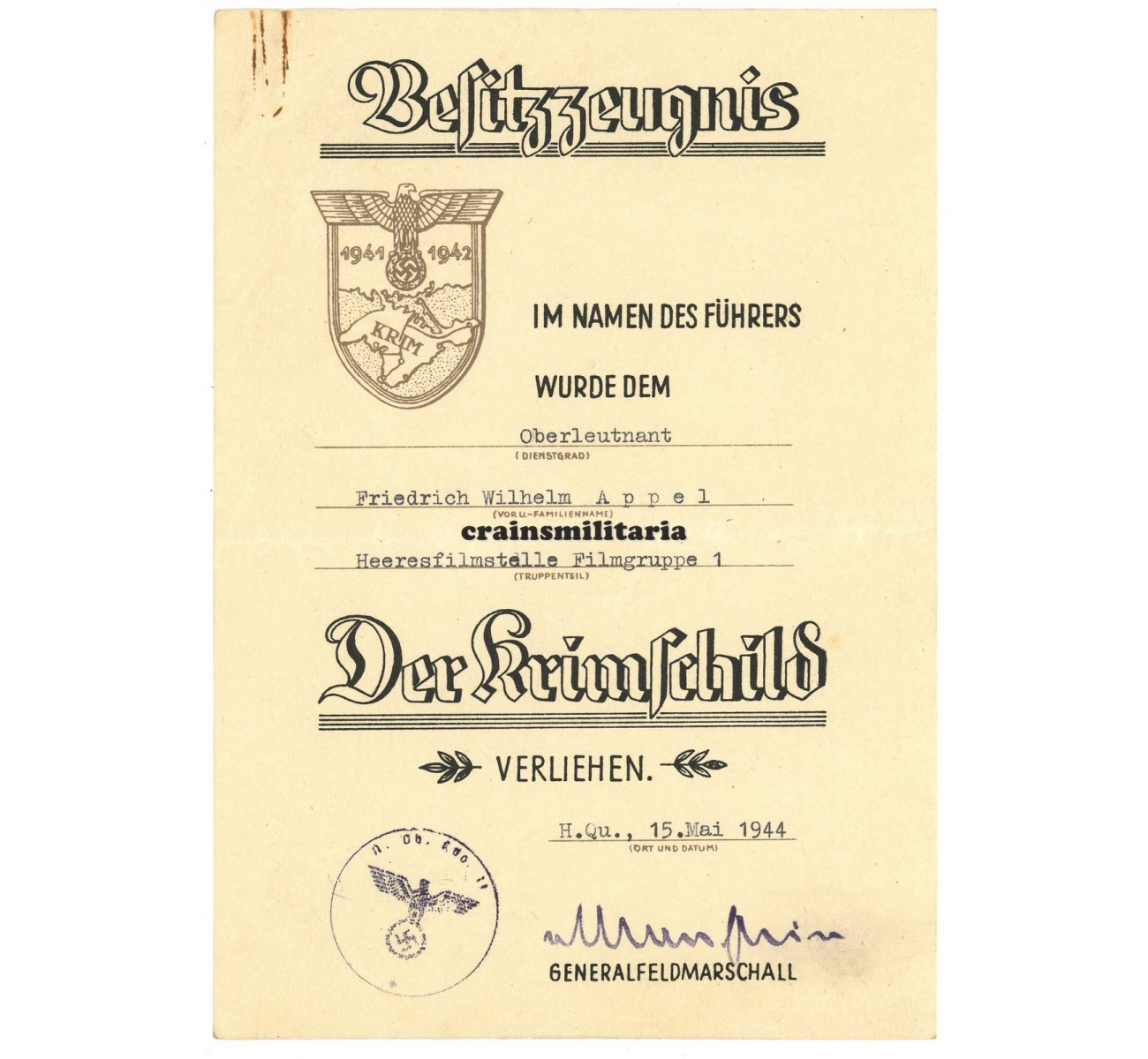 - Award document for the Krimschild, May 1944, facsimile signed by Generalfeldmarschall Erich von Manstein.