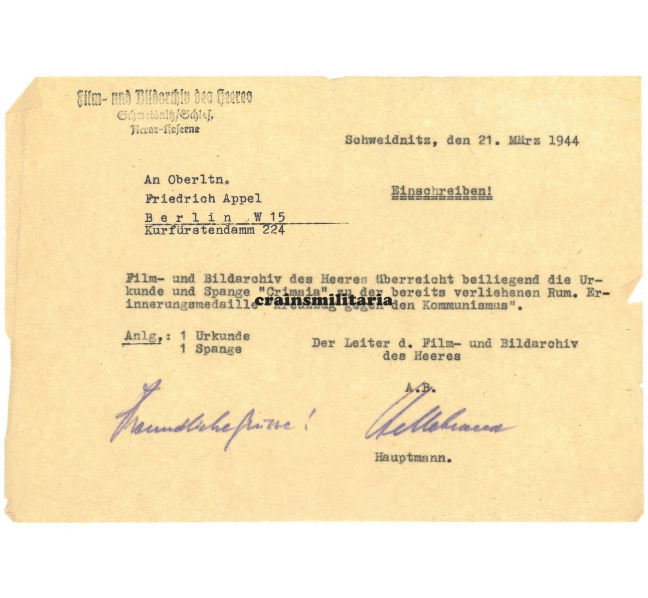 - Letter by the Film- und Bildarchiv des Heeres joined to this last award, notice Appel resided on the famous Kurfürstendamm in Berlin, the number 224 is now home to the Hard Rock Cafe...