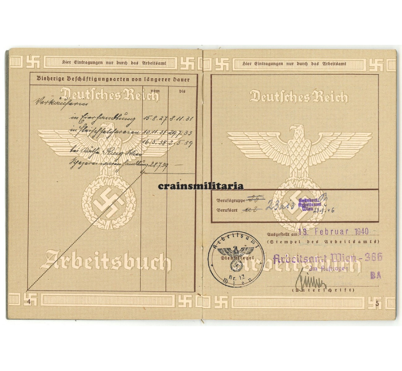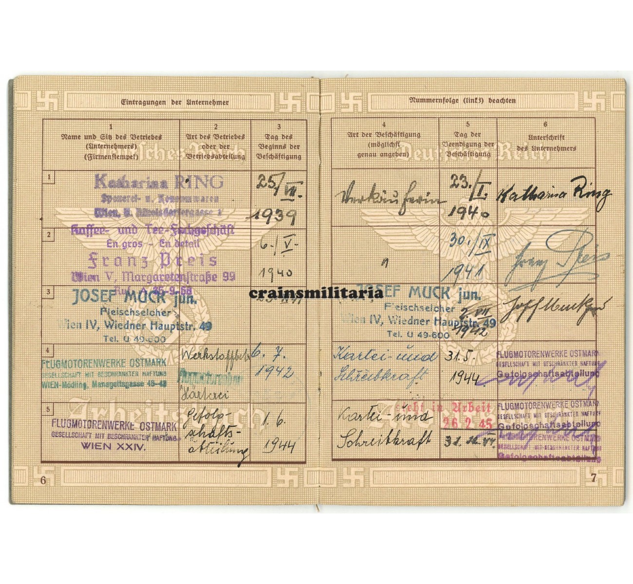 Arbeitsbuch to Katharina Grohsinger from Vienna. Second model issued in February 1940 by the Arbeitsamt Wien. After a few other jobs at the start of the war, she started working in the offices of the Flugmotorenwerke Ostmark in Wien-Mödling. This factory produced Daimler-Benz airplane motors, specifically the model Daimler-Benz DB 603, which was used in the Heinkel He 177 "Greif" bombers among others. She remained with the factory until the end of the war.