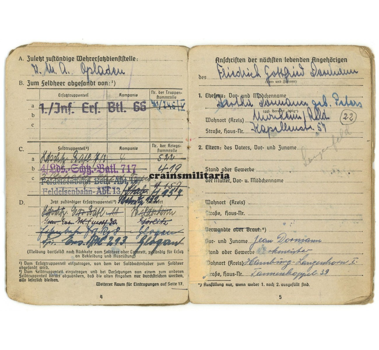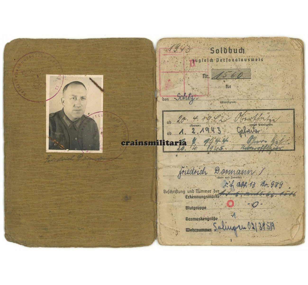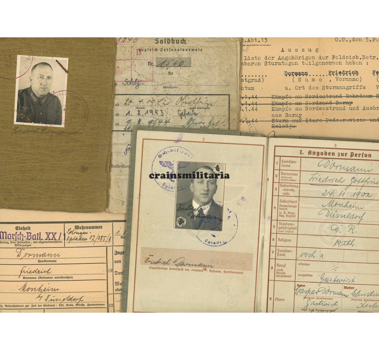 Soldbuch and Wehrpass grouping to Unteroffizier Friedrich Dormann. Called up by the Wehrmacht in January 1941, Dormann's main unit was Landesschützen-Bataillon 717 in Danzig (1941-'43), before sent off to a Holland based training with the 2./ Lehrabteilung des Chefs des Transportwesens in April 1943. He was then sent to the Feldeisenbahn-Betriebs-Abteilung 13, responsible for operating and maintaining military field railways in the East. Notice on page 1944 the anti-partisan fighting (Kämpfe m. Banden) and service in Hungary and Poland. Particularly interesting is a "Sturmtag" (assault day) he was attributed on 10th of January 1944 at Sarny, western Ukraine. Dormann received a last-minute promotion to Unteroffizier and survived the war.