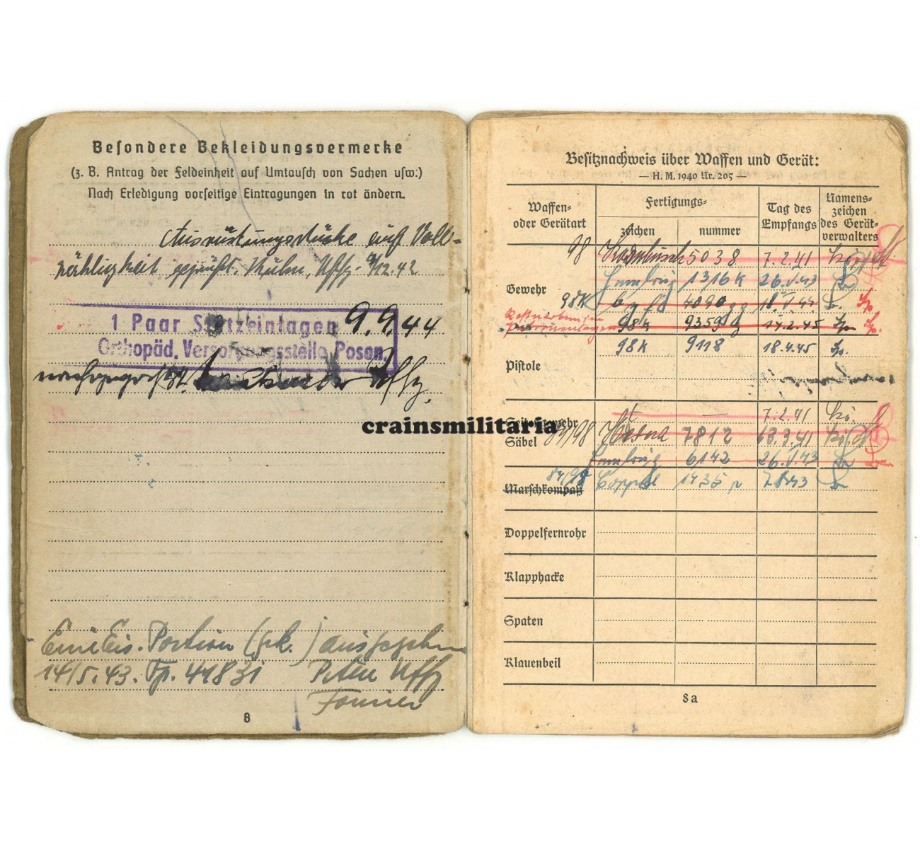 - Soldbuch, missing the pages 11-14 and the back cover. Interesting entries include the Führergeschenk and several pistols.