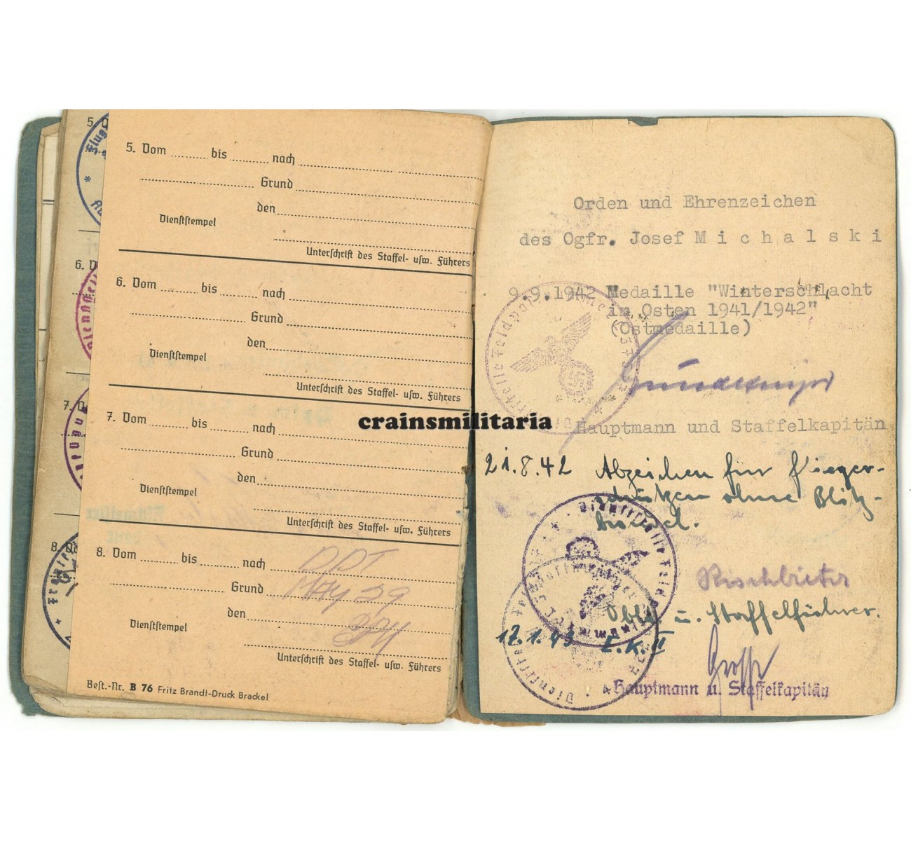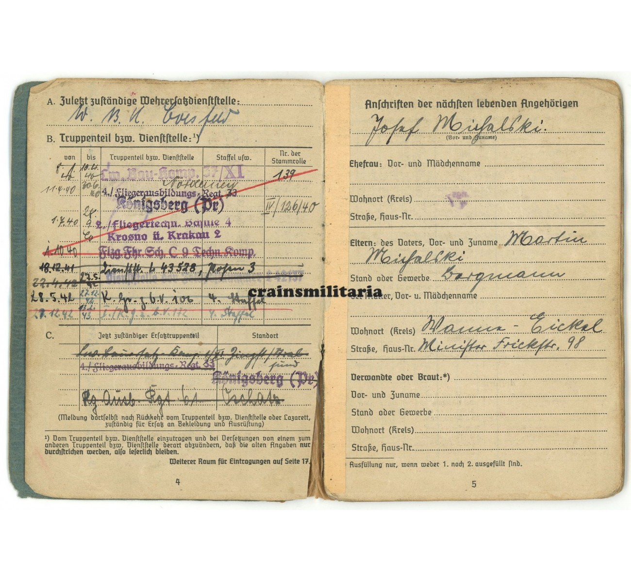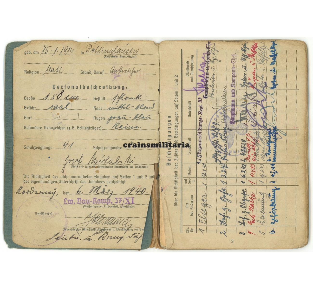 Soldbuch to Unteroffizier Josef Michalski. First issue from March 1940, when serving with a Luftwaffe construction unit on Norderney. Michalski later trained with the Fliegertechnische Schule 4 in occupied Poland (Kosno and Krakau), and with Flugzeugführerschule C 9 in Altenburg. December 1941, he was sent to the newly formed Kampfgruppe z.b.V. 999, formed as transport group with Ju 52 for the Eastern Front, also taking part in the Demjansk airlift operations.