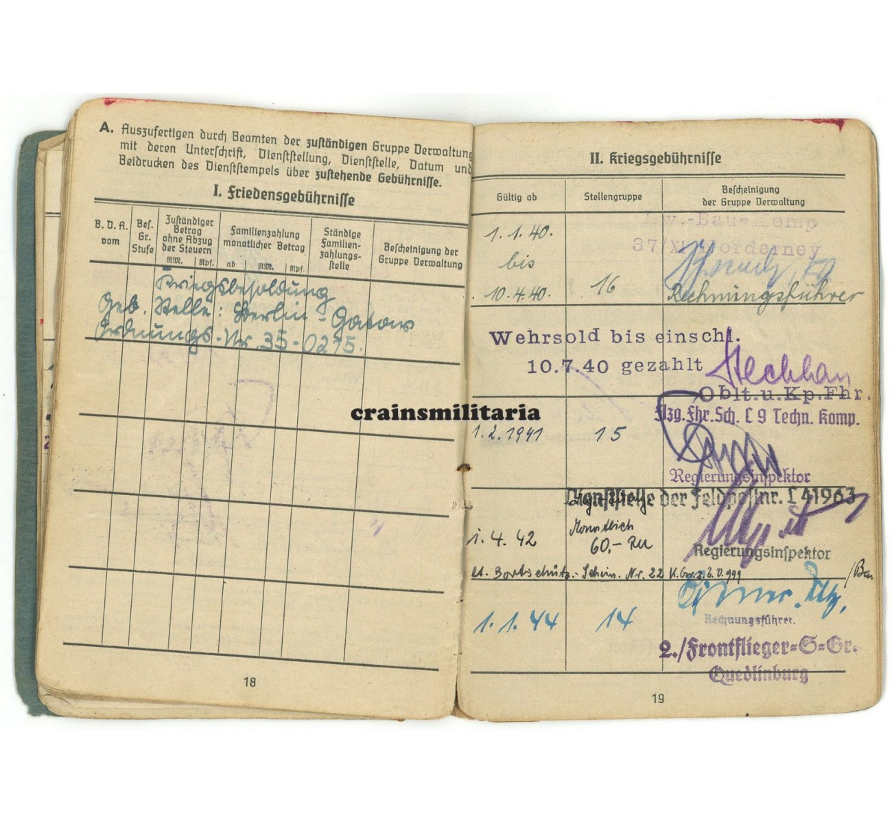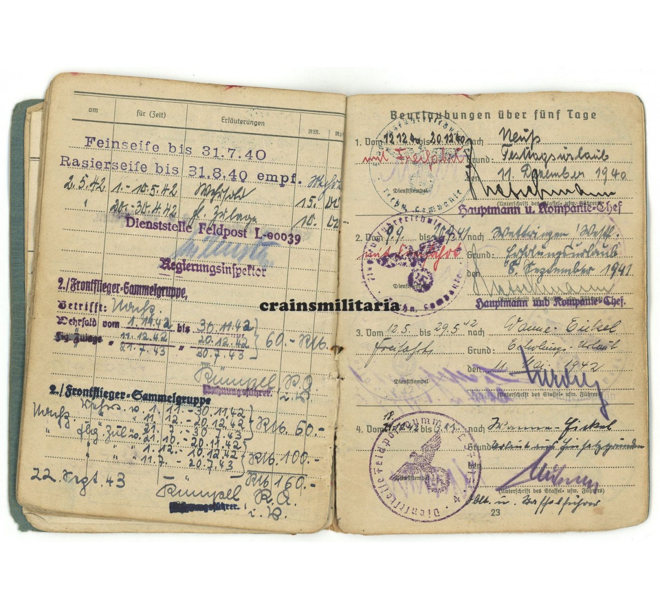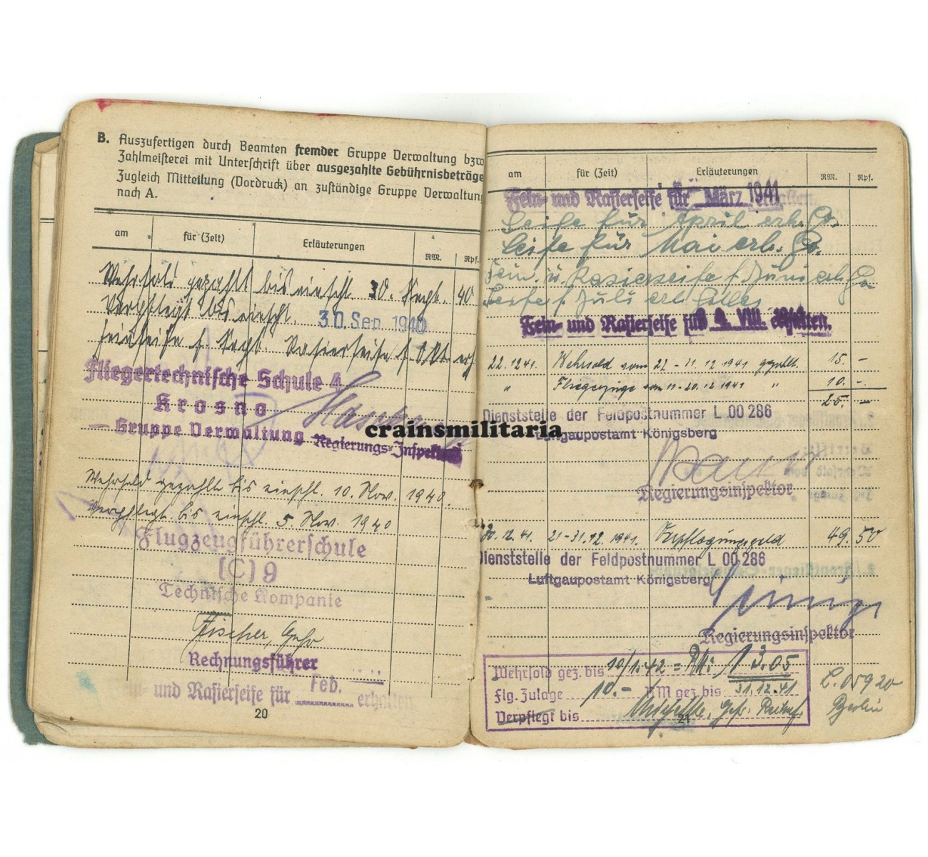 The Soldbuch is in well used but very good condition, complete with all pages and the portrait photo. Interesting entries include a Hungarian M37 pistol, a Luger P.08 pistol, an extra "Fliegerschutze" pay on page 19 referring to his Bordschützen-Schein, and various signatures of "Staffelkapitän" pilot officers.
