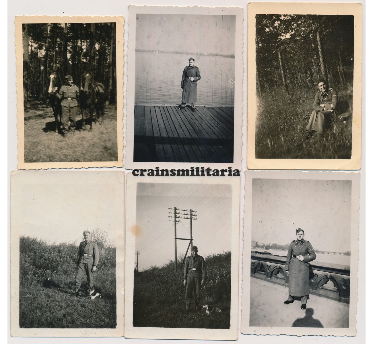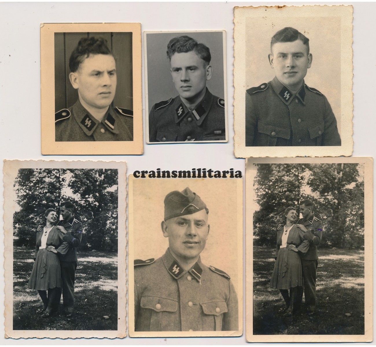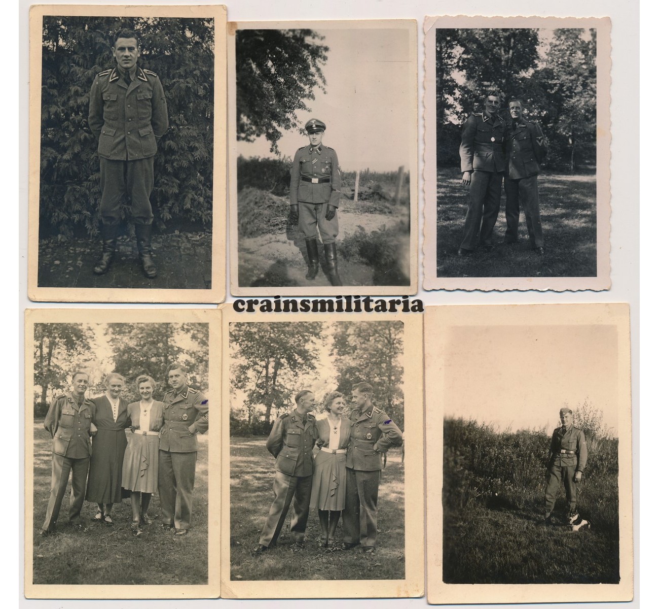 Photo grouping to an Unterscharführer of the SS Germania Standarte / Regiment. Totals 18 private photos taken between 1940 and 1944, mostly in size 6x9 cm. Several photos show the Germania cufftitle in wear. Four are studio portraits. A couple of photos have been censored with blue pen as can be seen in the detail (could be removed?). A couple have writings on the back.